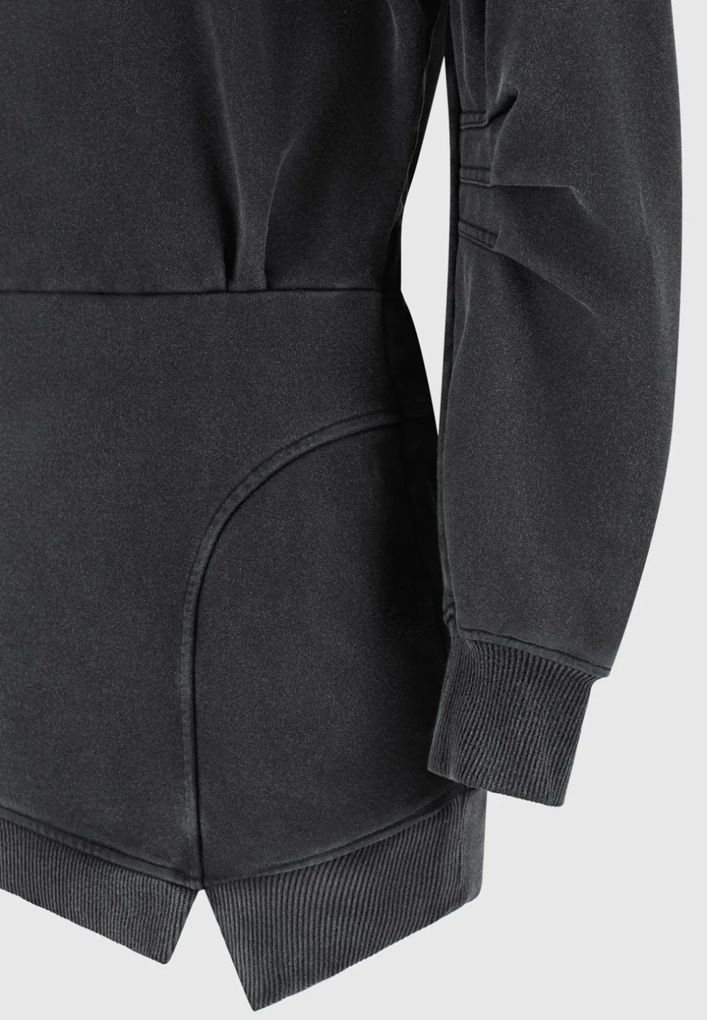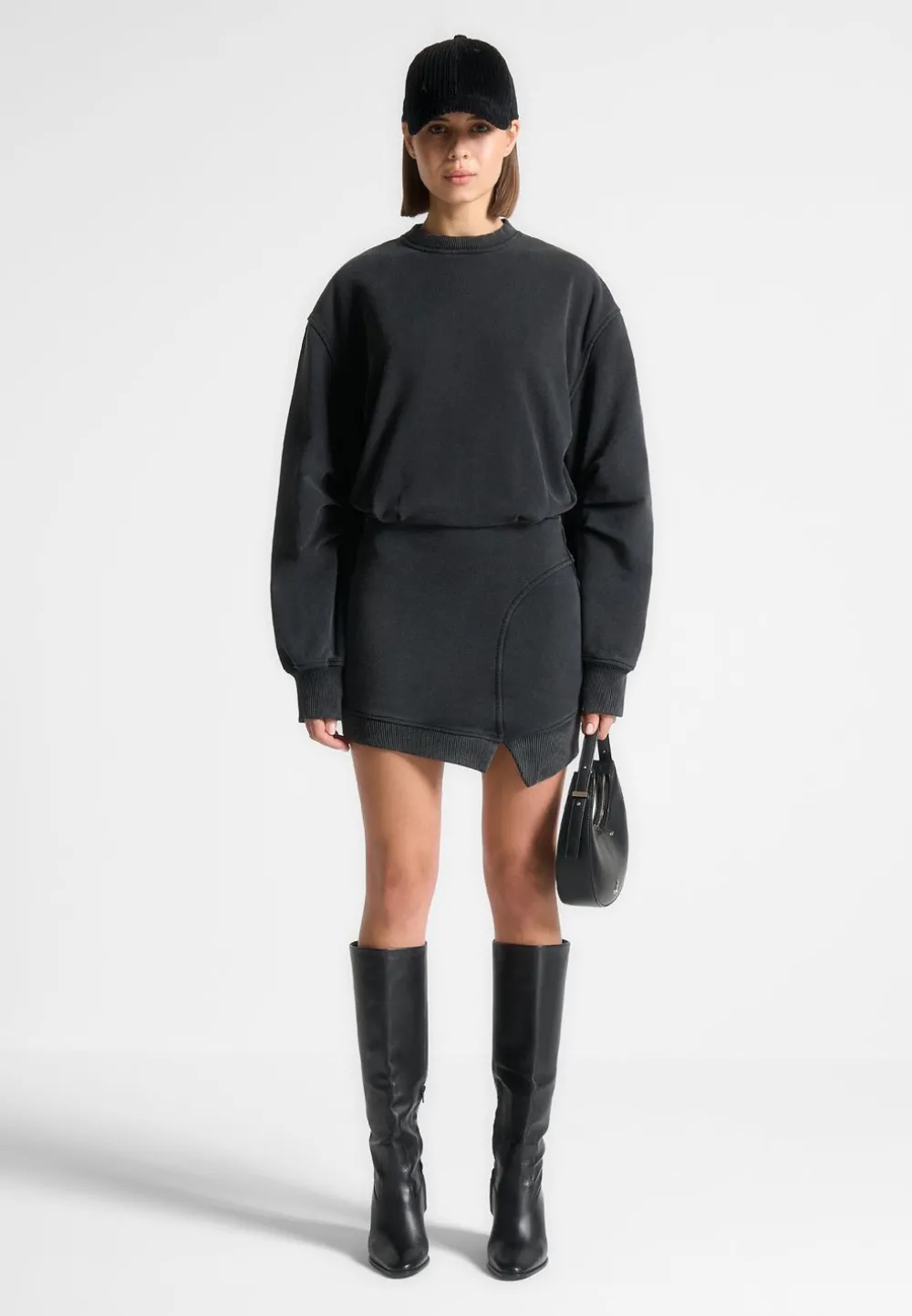 This Asymmetric Hem Jumper Dress Offers A Soft Touch And Comfortable Fit For A Versatile And Stylish Addition To Your Wardrobe. Made With High-Quality Materials, This Washed Black Dress Is Perfect For Many Occasions, Providing Both Comfort And Style In One Package.