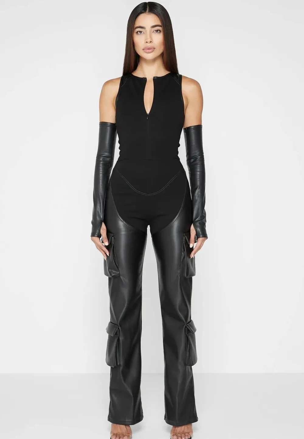 The Contouring Effect On The Bodice Of This Jumpsuit Combined With The Bandage Fabric Cinch The Waist While The Vegan Leather Legs Drape Effortlessly.