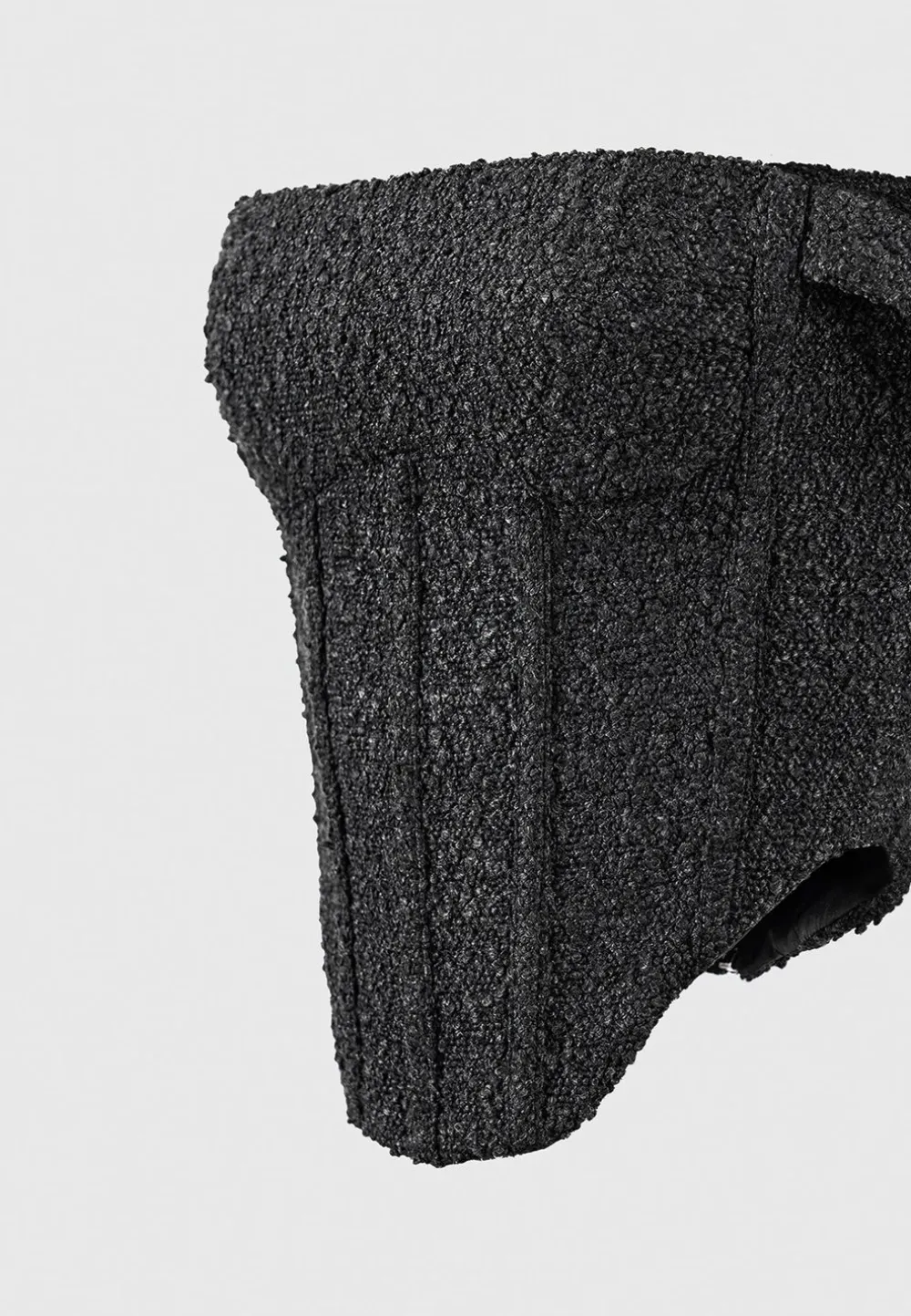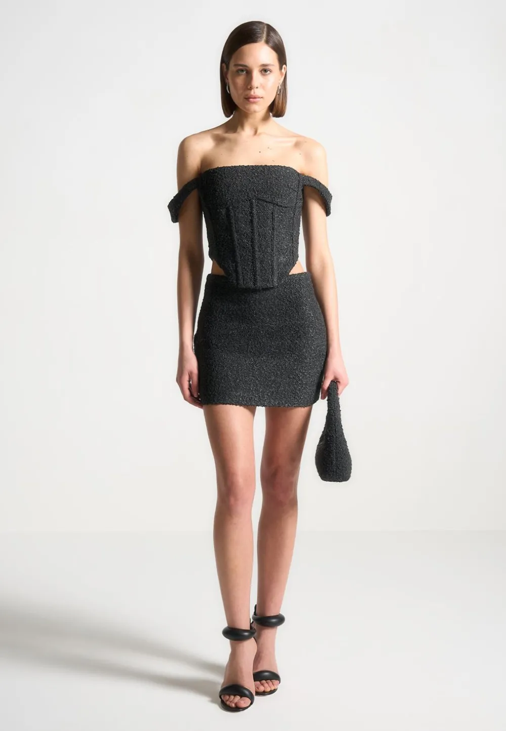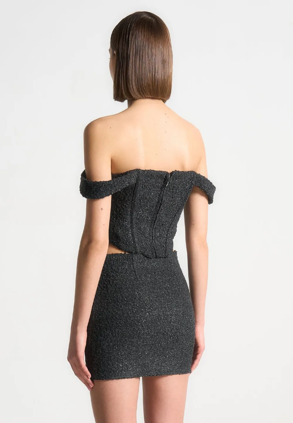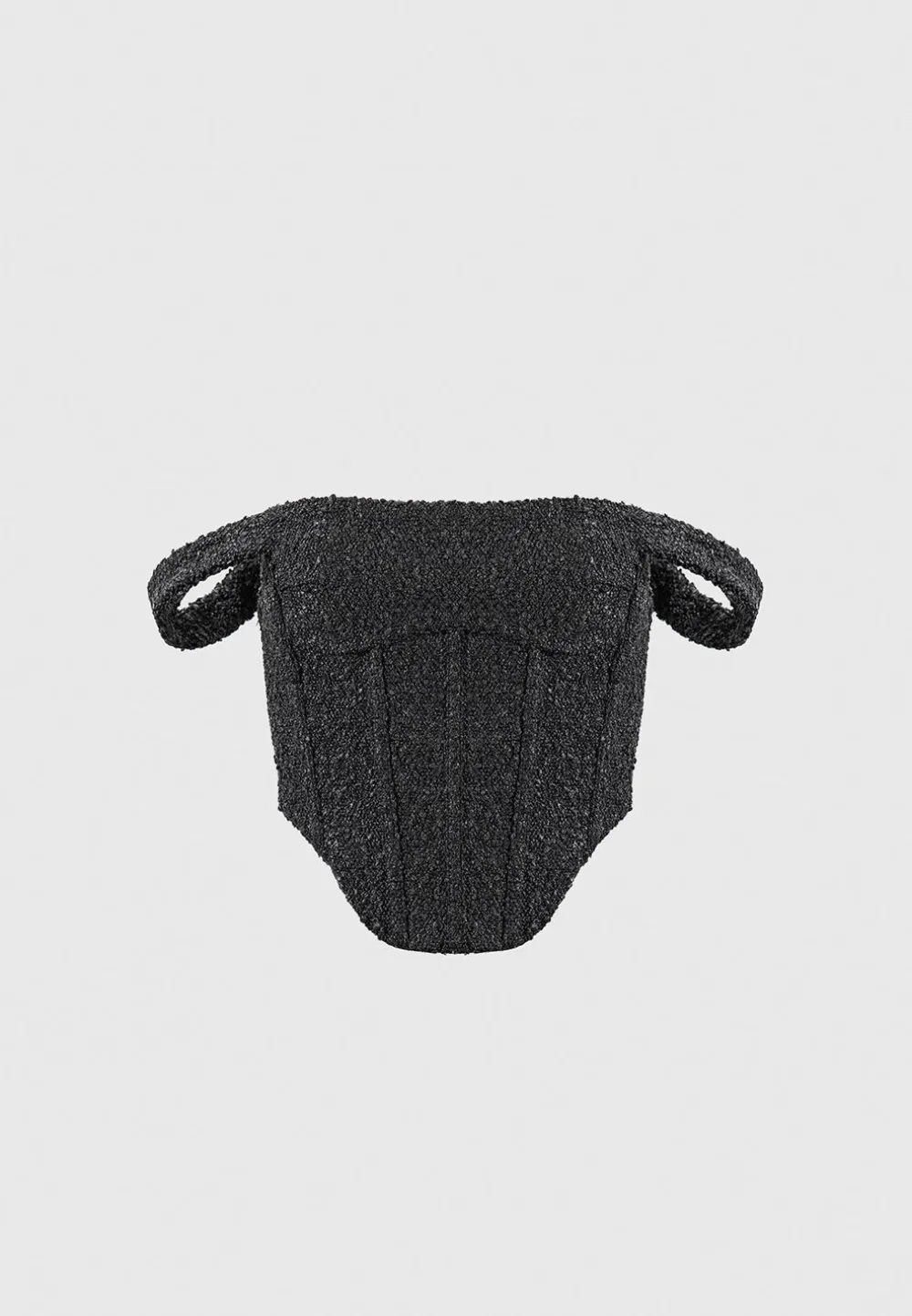Crafted From High-Quality Boucle Fabric, This Bardot Corset Top Boasts An Elegant Dipped Hem. With A Sleek And Sophisticated Design, This Top Is Perfect For Any Occasion. Upgrade Your Wardrobe With This Versatile And Stylish Piece.
