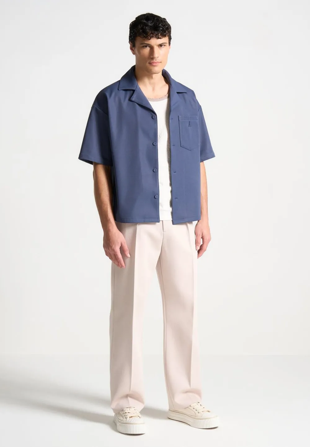Elevate Your Wardrobe With Our Boxy Twill Revere Shirt In Steel Blue, Meticulously Tailored With A Boxy Fit To Suit Any Body Type. The Tonal Embroidery On The Front Pocket Adds A Refined Touch, Complemented By The Tonal Fabric Covered Buttons And Revere Collar To Complete The Ensemble.