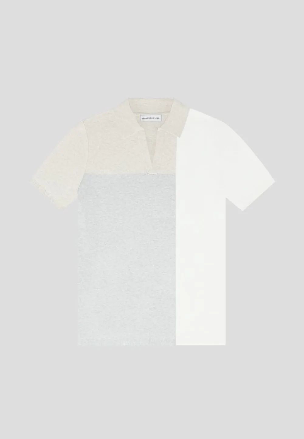 This Beige And Grey Colour Block Knit Revere Polo Top Is A Stylish Addition To Any Outfit. Featuring A Classic Polo Top Style And Colour Block Accents, This Piece Is Perfect For Any Casual Or Smart-Casual Occasion. The Breathable And Lightweight Material Provides All-Day Comfort.