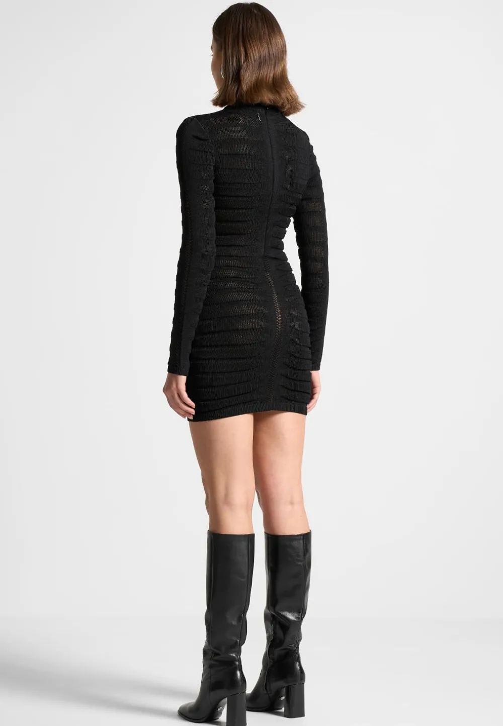 This Classic Black Knit Mini Dress Features Knit Contour Detailing And A Soft Touch For A Flattering Fit. Perfect For A Night Out, The Figure-Hugging Material Is Sure To Make An Impression.