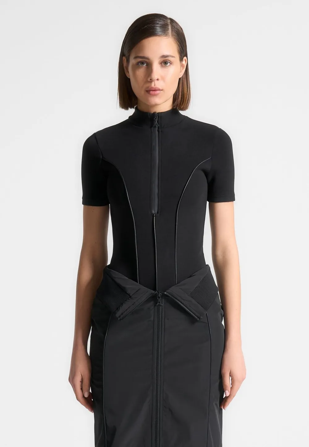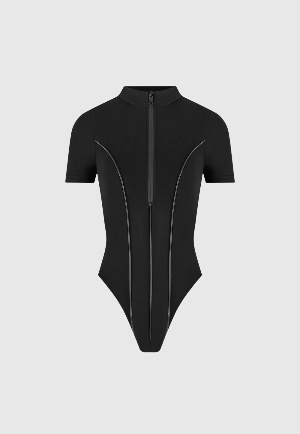 The Contour Mock Neck T-Shirt Bodysuit In Black Offers A Modern And Sleek Look With Its High Neckline And Contour Detailing. The Short Sleeves Add A Touch Of Versatility, Making It A Perfect Addition To Any Wardrobe. Elevate Your Style With This Sophisticated And Form-Flattering Bodysuit.