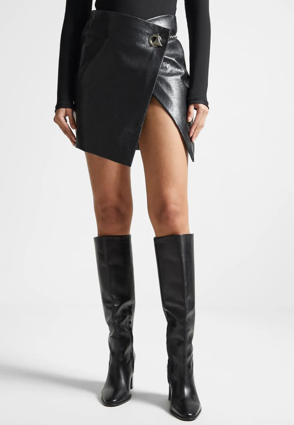 This Edgy Cracked Vegan Leather Wrap Skirt Is Made With A Textured Premium Fabric And Features A Chain Detail To Complete The Look. Perfect For Day-To-Night Wear And Adding Edge To Any Outfit.