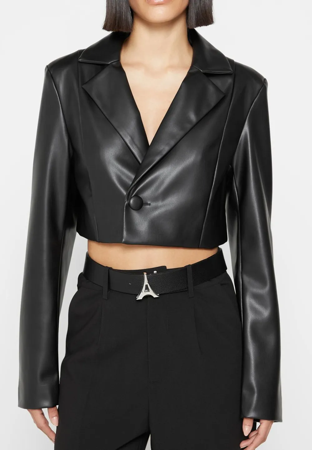 This Cropped Vegan Leather Blazer With Open Back Is The Perfect Blend Of Style And Comfort. Featuring An Open Back And Cropped Fit, It Moves With Your Body While Making A Statement. Classically Stylish And Timeless, This Blazer Will Be A Go-To Item In Your Wardrobe.