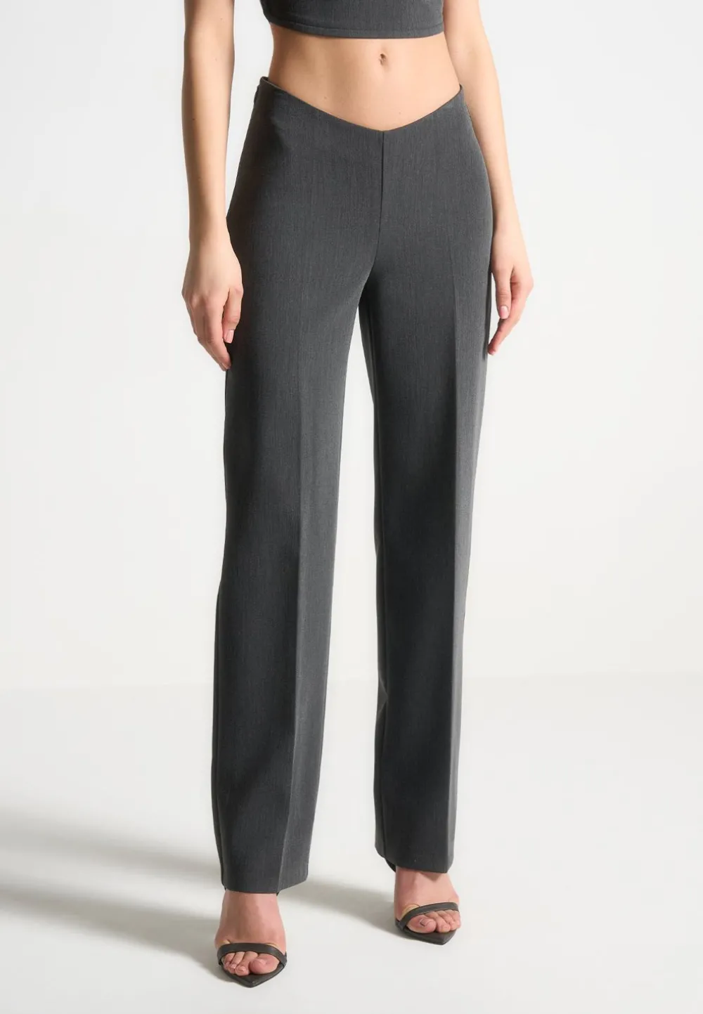 These Curved Waist Tailored Trousers In Dark Grey Are Perfect For Both A Dressed Up Or Smart Casual Look. Featuring Crease Detailing For A Tailored Look And A Curved Waistband For Added Style, These Trousers Are Versatile And Chic; A Must-Have For Any Wardrobe.