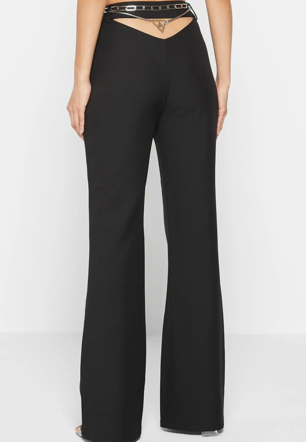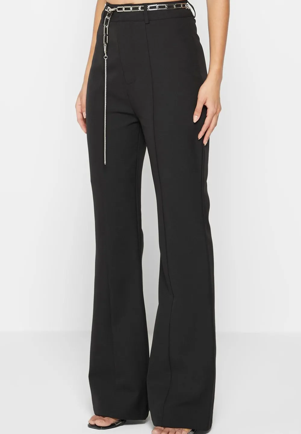 These Stylish Black Trousers Offer A Flattering Fit And Feature A Detailed Chain Belt For A Modern Twist. The Fit And Flare Design Creates A Smooth And Elegant Silhouette, Perfect For Any Occasion.