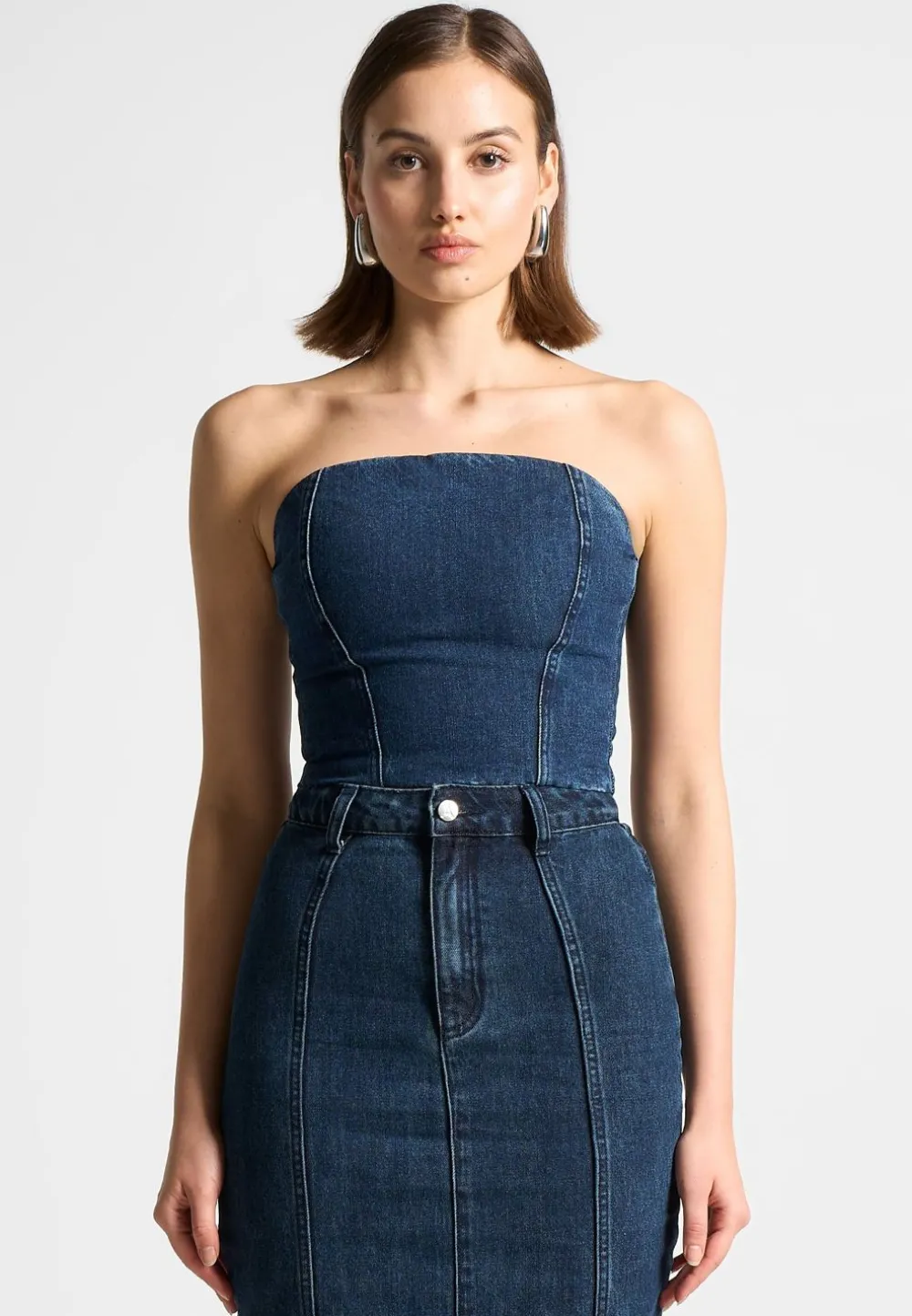 This Premium Denim Bandeau Corset Top Is Designed To Flatter Your Figure. Crafted From Indigo Denim Fabric, Its Shape Creates An Hourglass Silhouette For A Modern And Stylish Look.