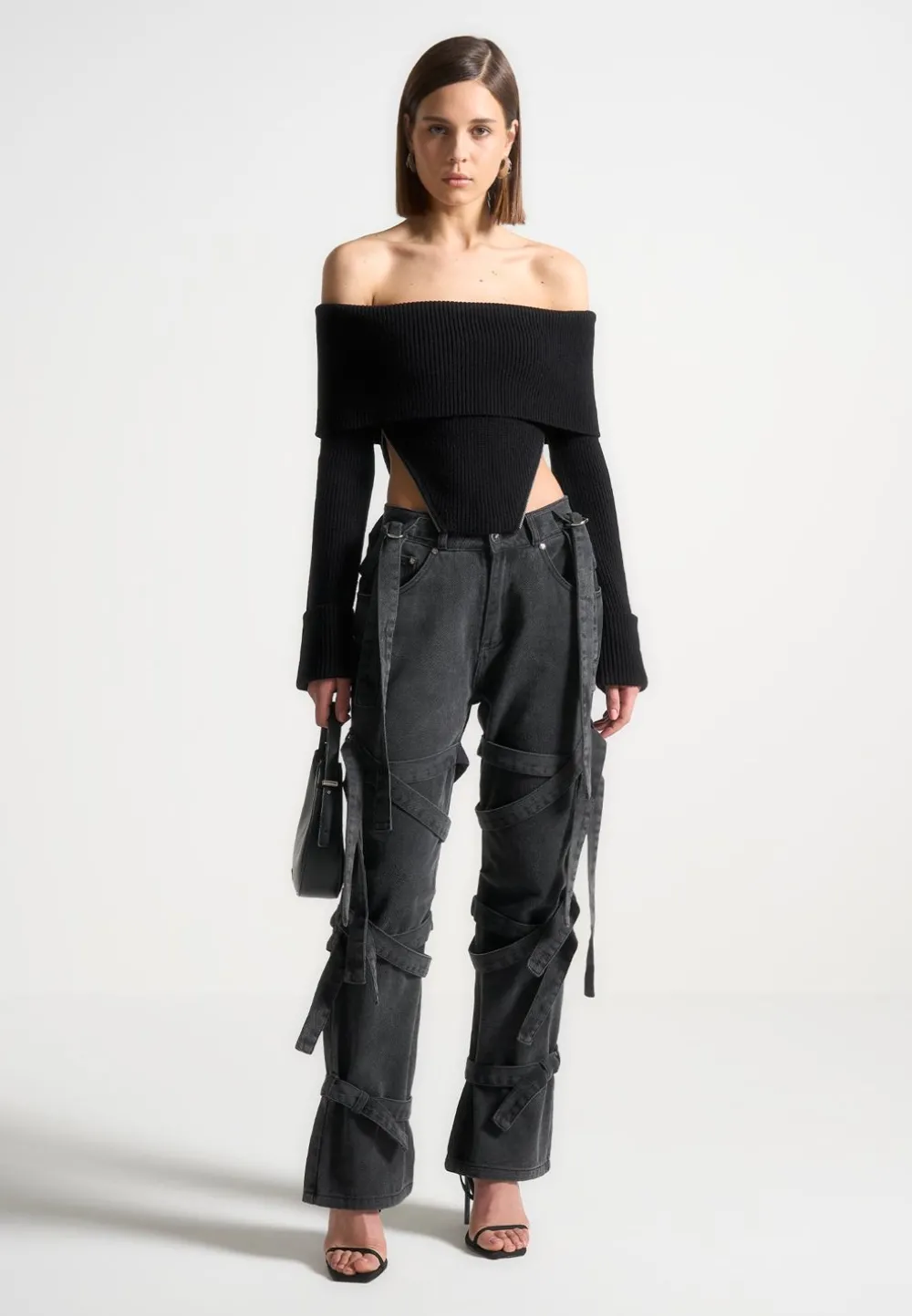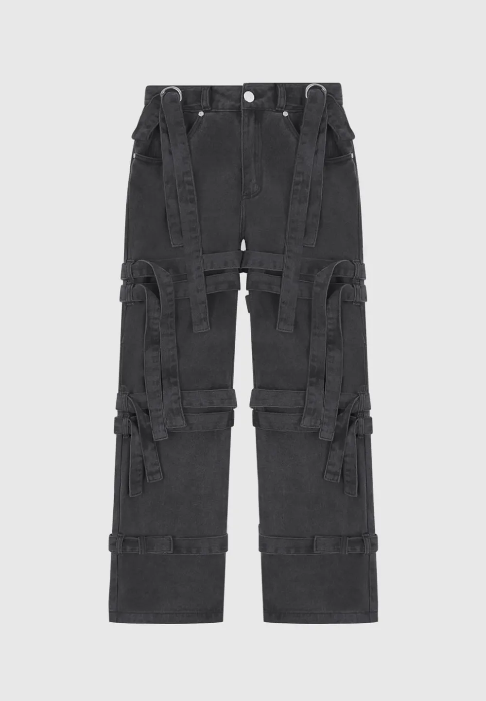 The Exaggerated Leg Strap Detailing Adds An Edgy Element To These Denim Strap Cargo Jeans. Style With A Pair Of Sneakers For An Effortlessly Cool Look.