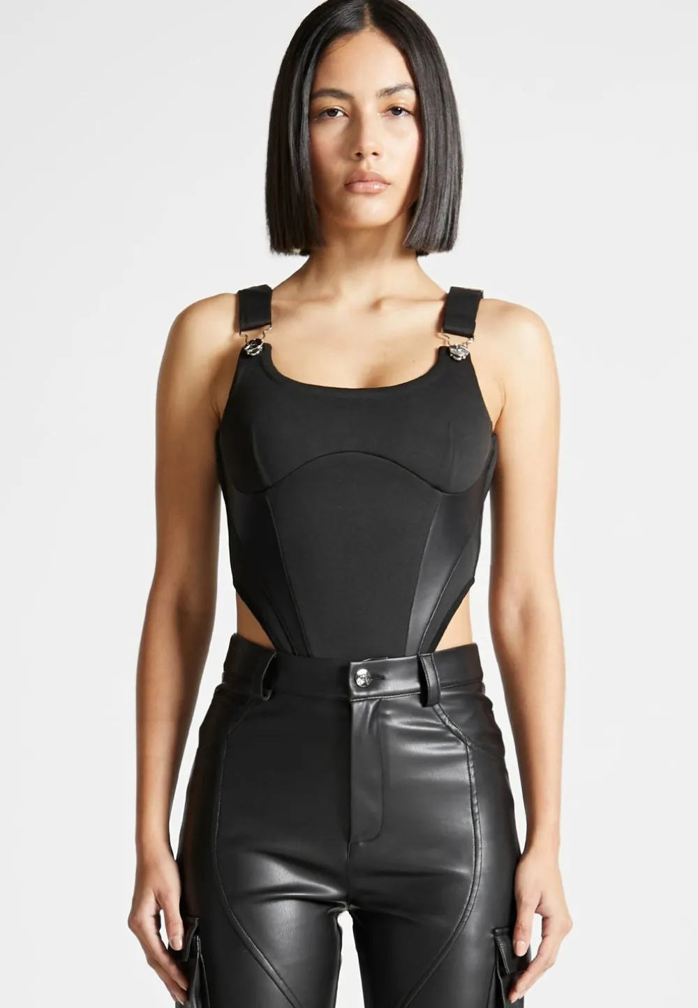 The Eiffel Detail High Leg Bodysuit Is Elegantly Designed With Vegan Leather Detailing. The Adjustable Straps Make For A Perfect Custom Fit, While Adding A Stylish Detail. Create A Timeless Look That’s Sure To Turn Heads.