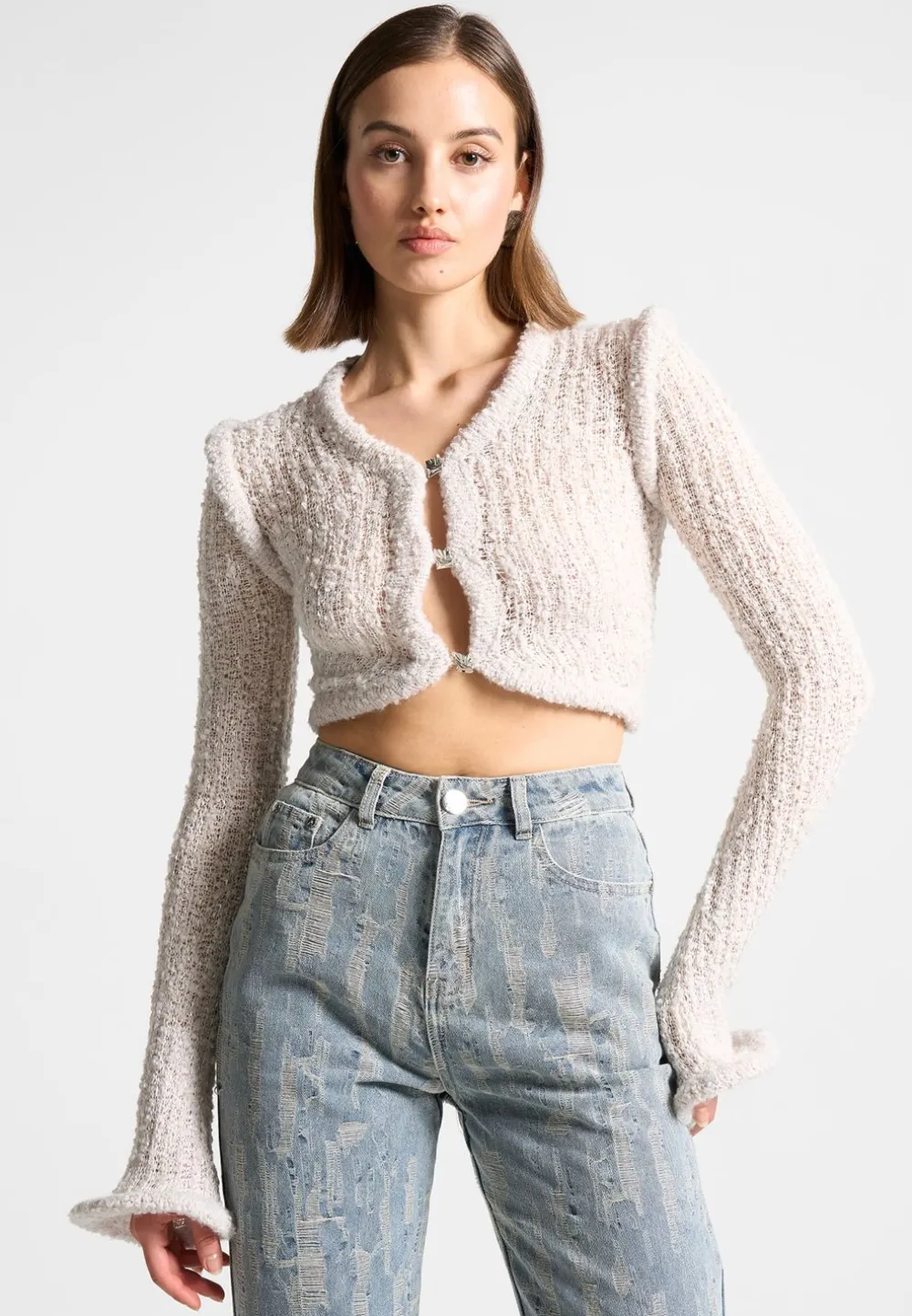 This Classic Cardigan Has A Textured Knit Design And Features Flared Sleeves For A Timeless Look. Its Soft Feel Makes It Perfect For Everyday Wear.