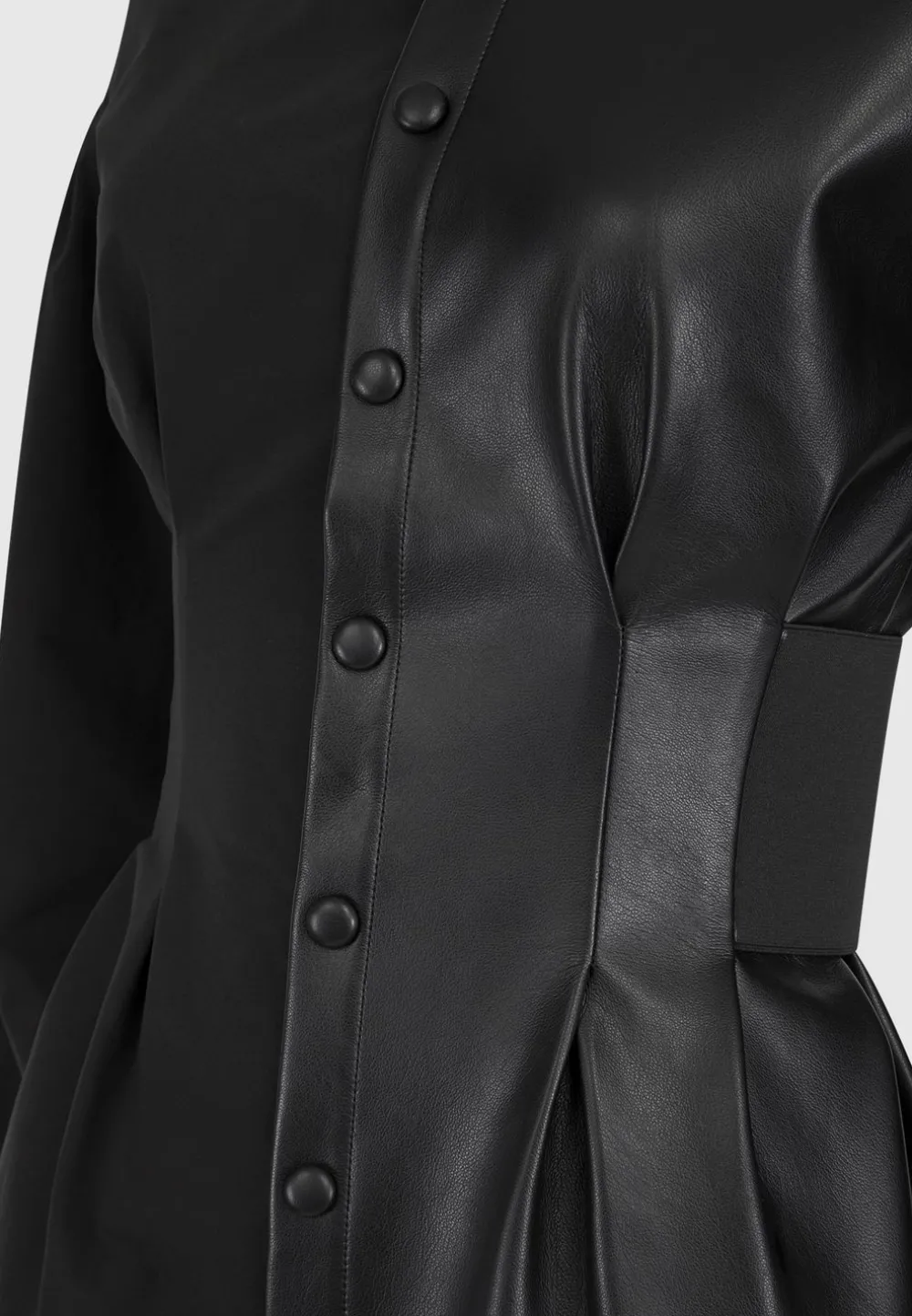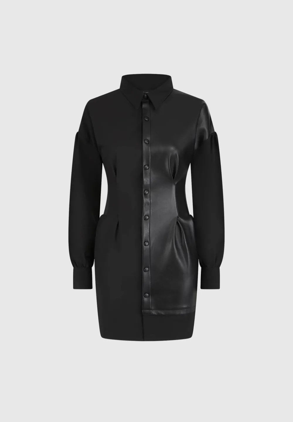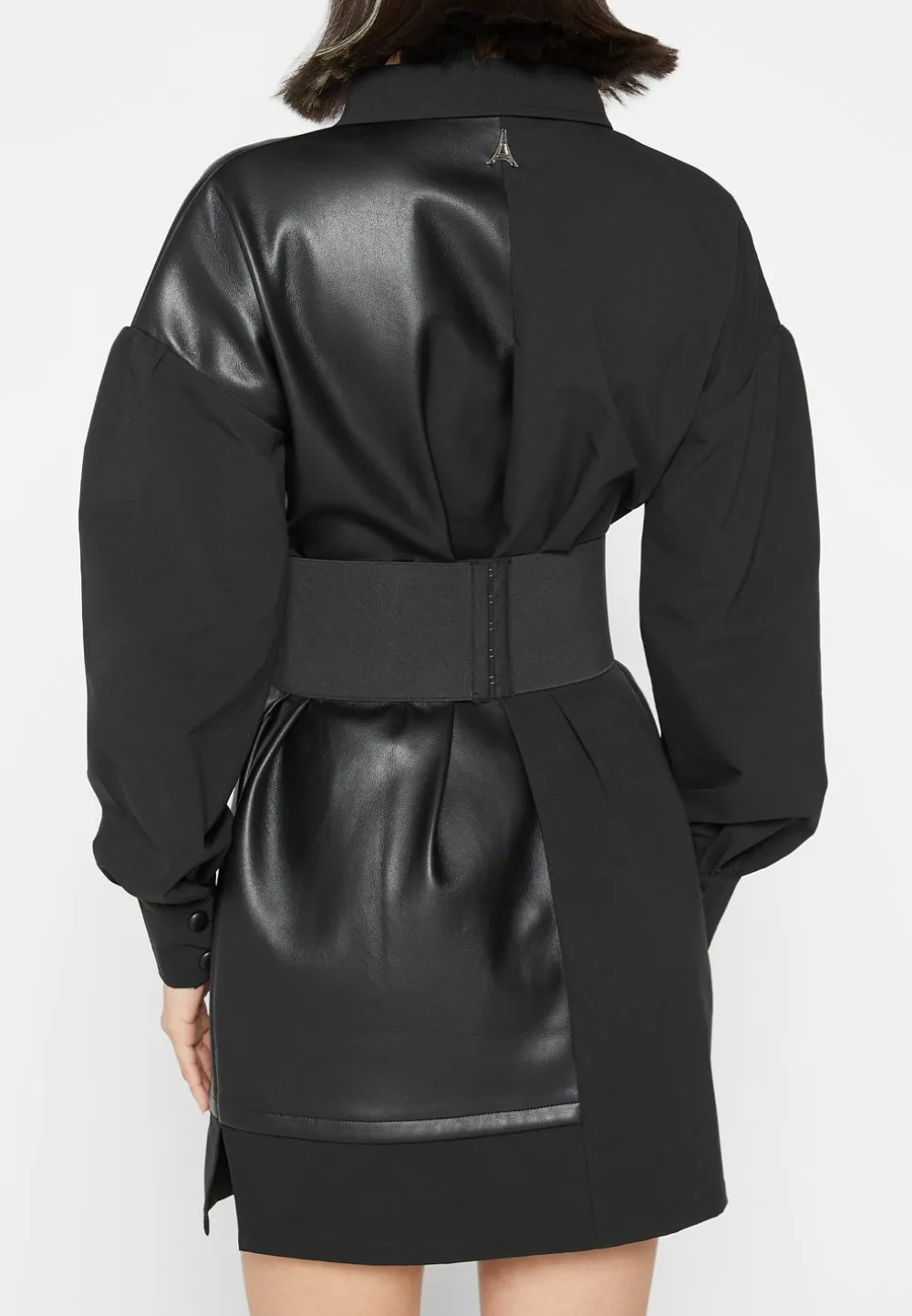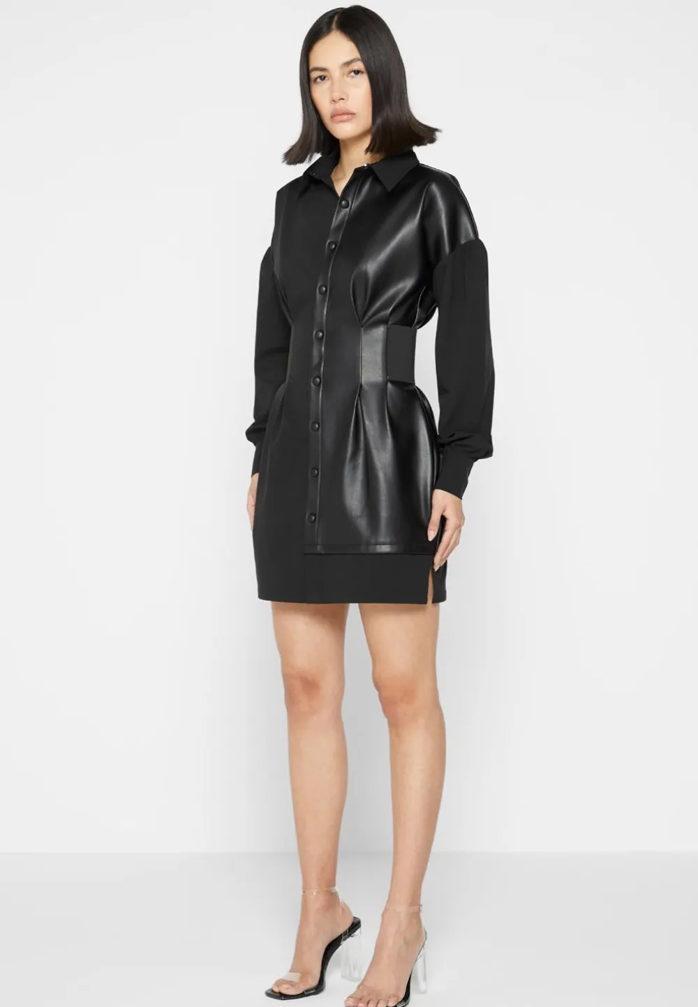 Achieve The Perfect Balance Of Stylish And Fashion Forward With The Half Vegan Leather Shirt Dress. Crafted From Half Vegan Leather And Featuring A Cinch Waistband And Oversized High Low Hem, This Dress Is Sure To Become A Wardrobe Staple.