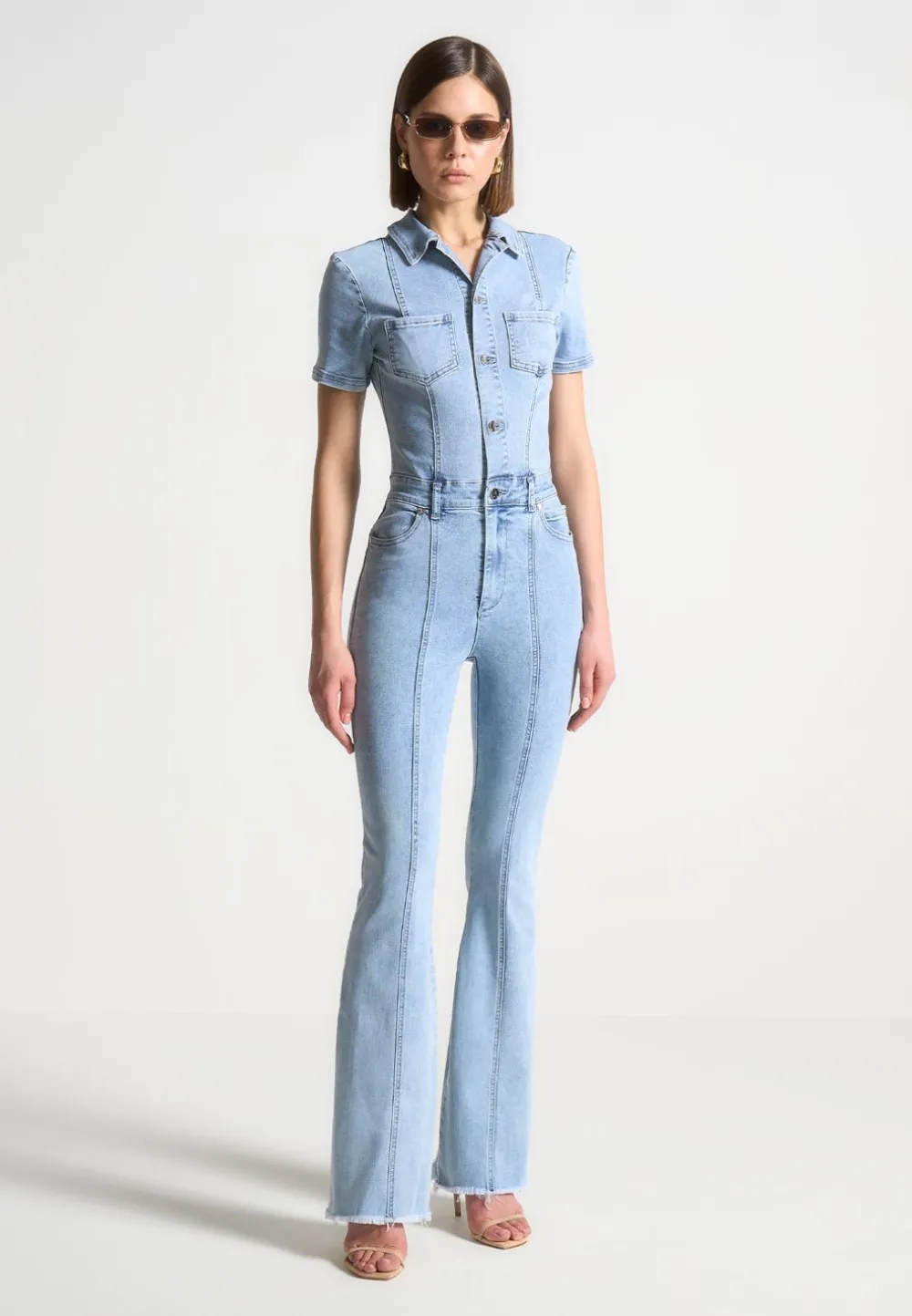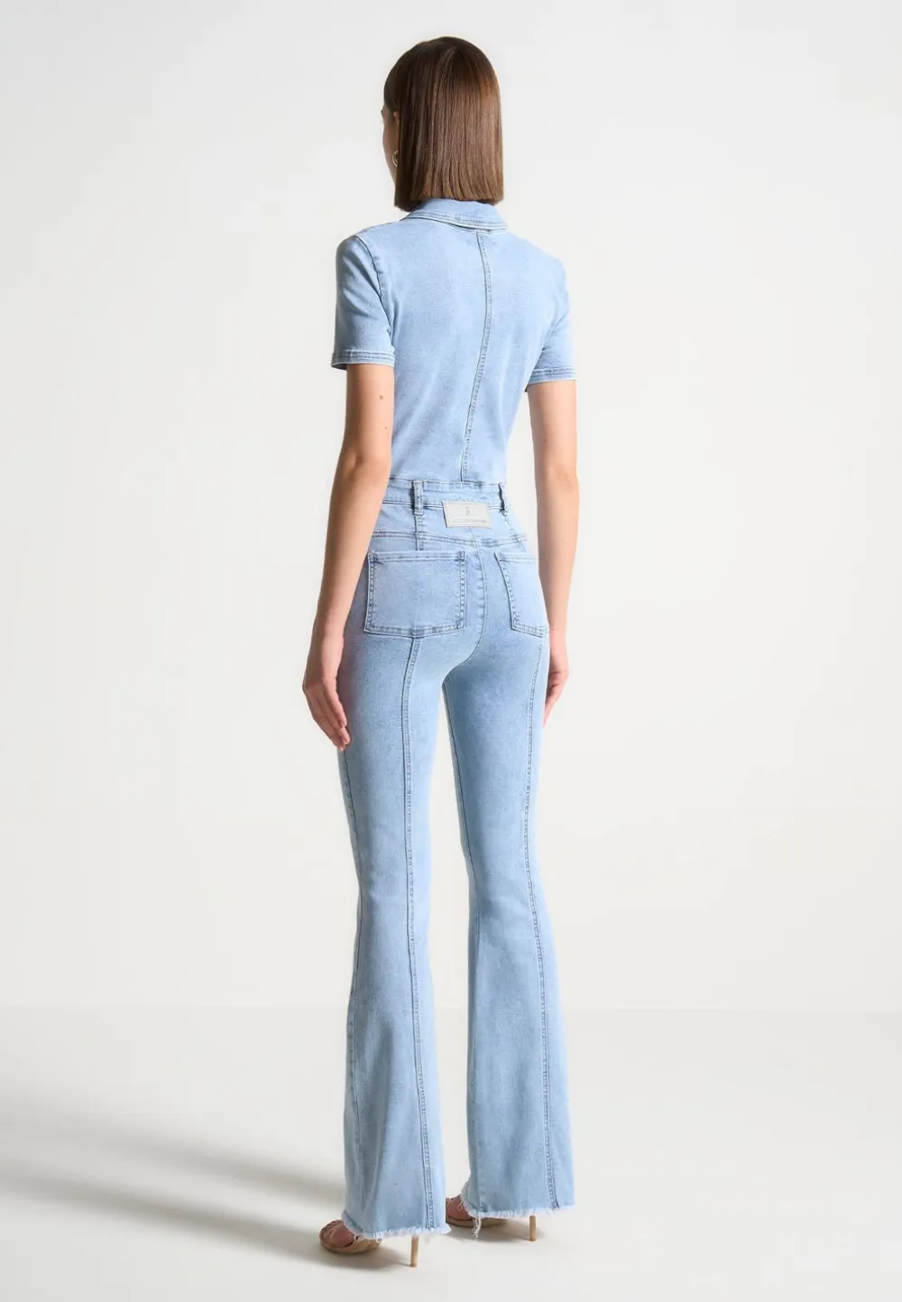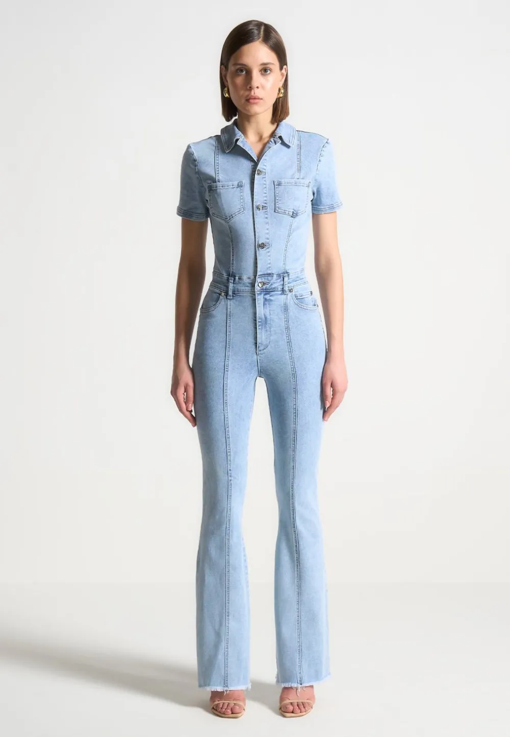Expertly Crafted And Designed For Ultimate Comfort And Style, Our Mini Flared Denim Jumpsuit In Mid Blue Is A Must-Have Addition To Your Wardrobe. Made With Stretch Fabric For A Figure Flattering Fit, And Featuring A Flared Silhouette, It’s The Perfect Piece For Any Occasion. Upgrade Your Look With This Jumpsuit.