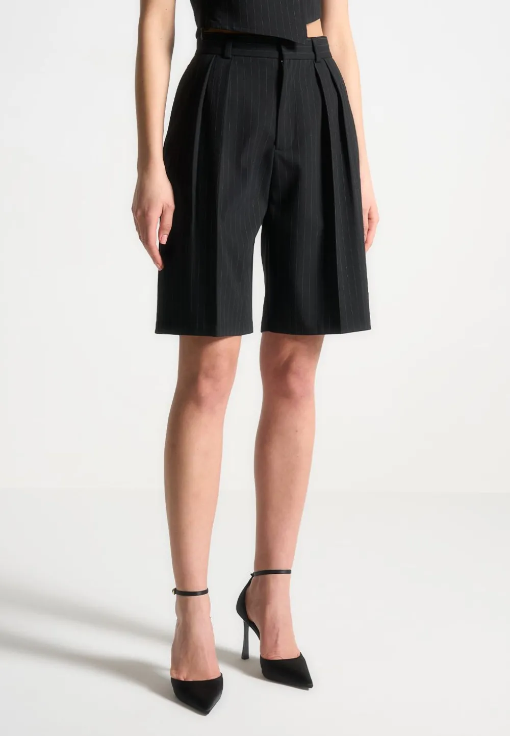 Expertly Crafted With Pleat Detailing And A High-Waisted Design, Our Pinstripe Tailored City Shorts Are The Perfect Addition To Any Professional Wardrobe. Elevate Your Style And Stay Comfortable All Day With These Sleek And Sophisticated Shorts.