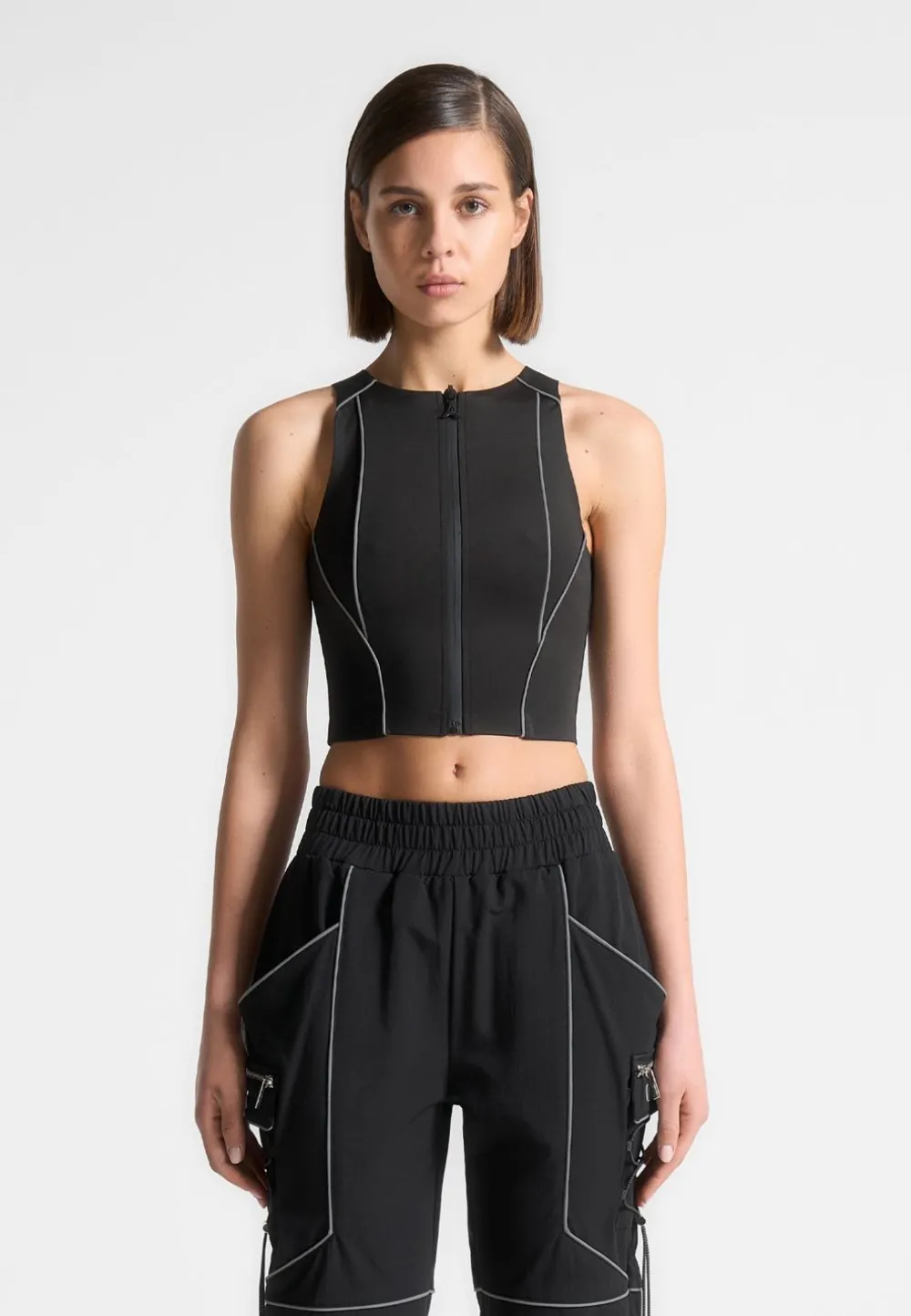 Expertly Designed, Our Reflective Piped Racer Crop Top Features Contour Lines For A Streamlined Look. Made With Lightweight, High-Quality Fabric, It Offers A Sleek Fit And Comfortable Wear. The Racer Neckline Adds A Touch Of Sporty Style To Your Workout Wardrobe.