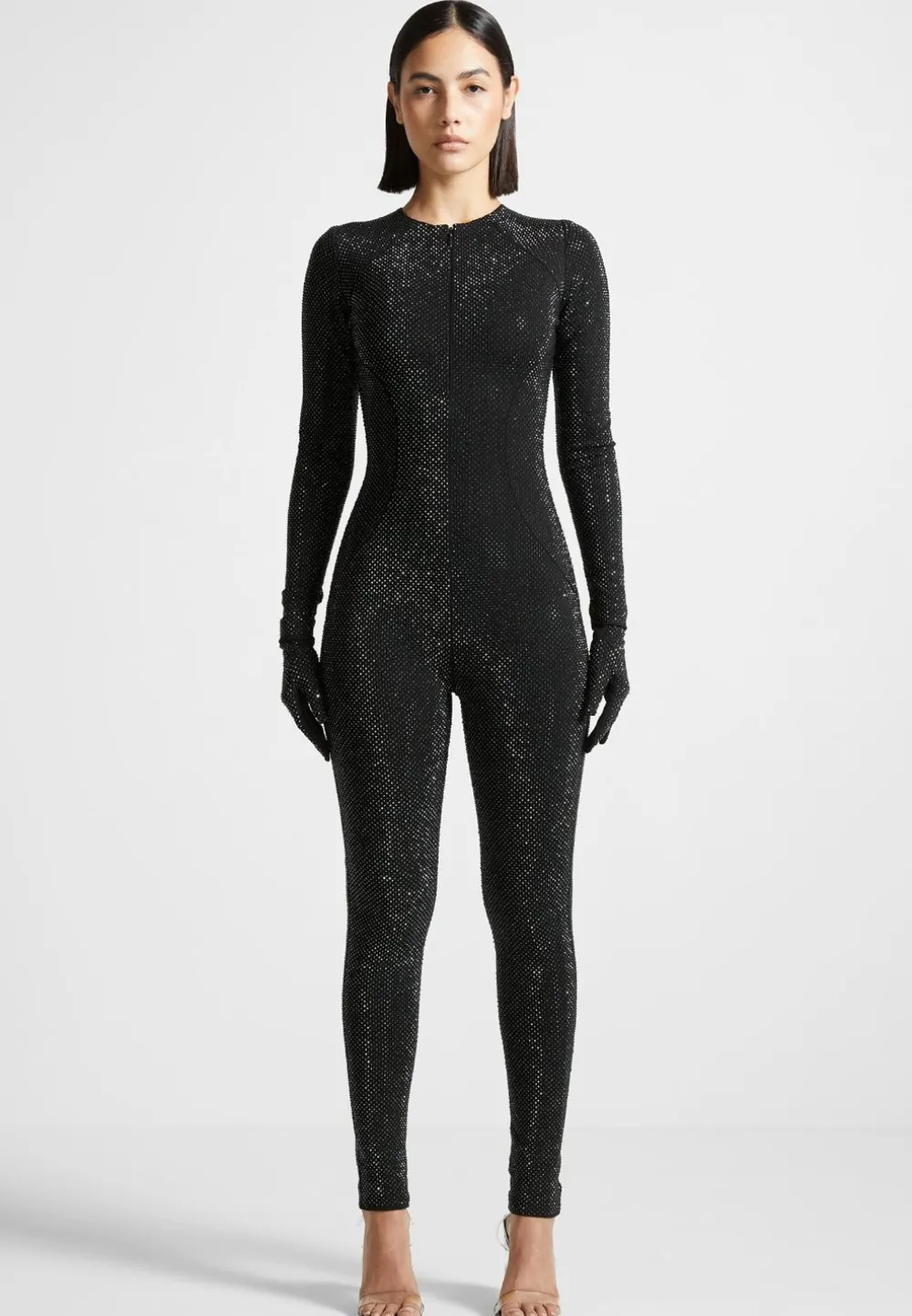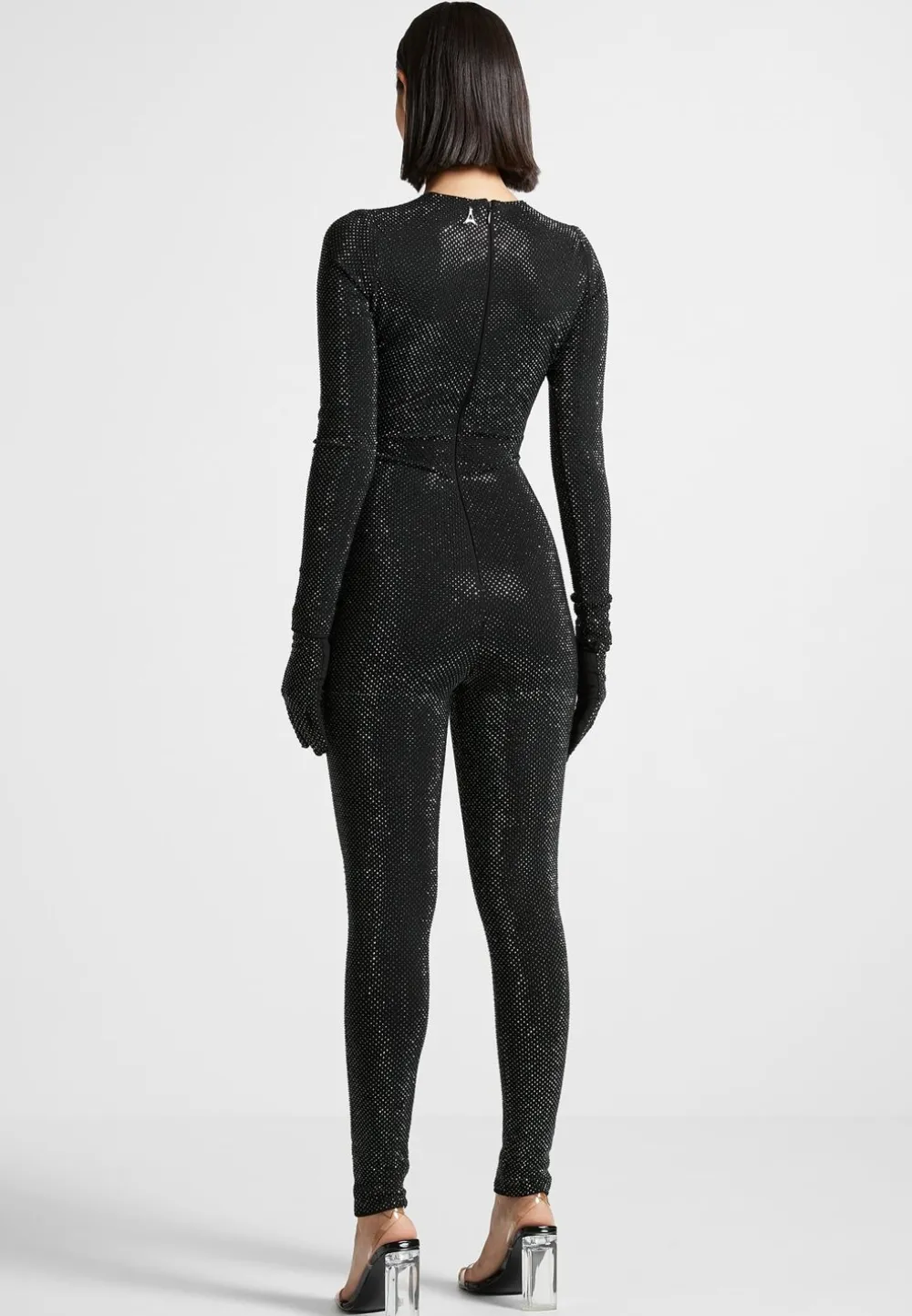 This Black Rhinestone Jumpsuit With Gloves Is The Perfect Way To Show Off Your Glamorous Side. Sparkling Rhinestones Will Have You Standing Out From The Crowd And Making A Statement. Let Yourself Shine And Feel Confident In This Unique Jumpsuit.