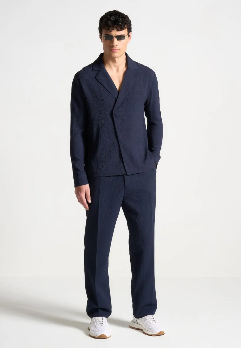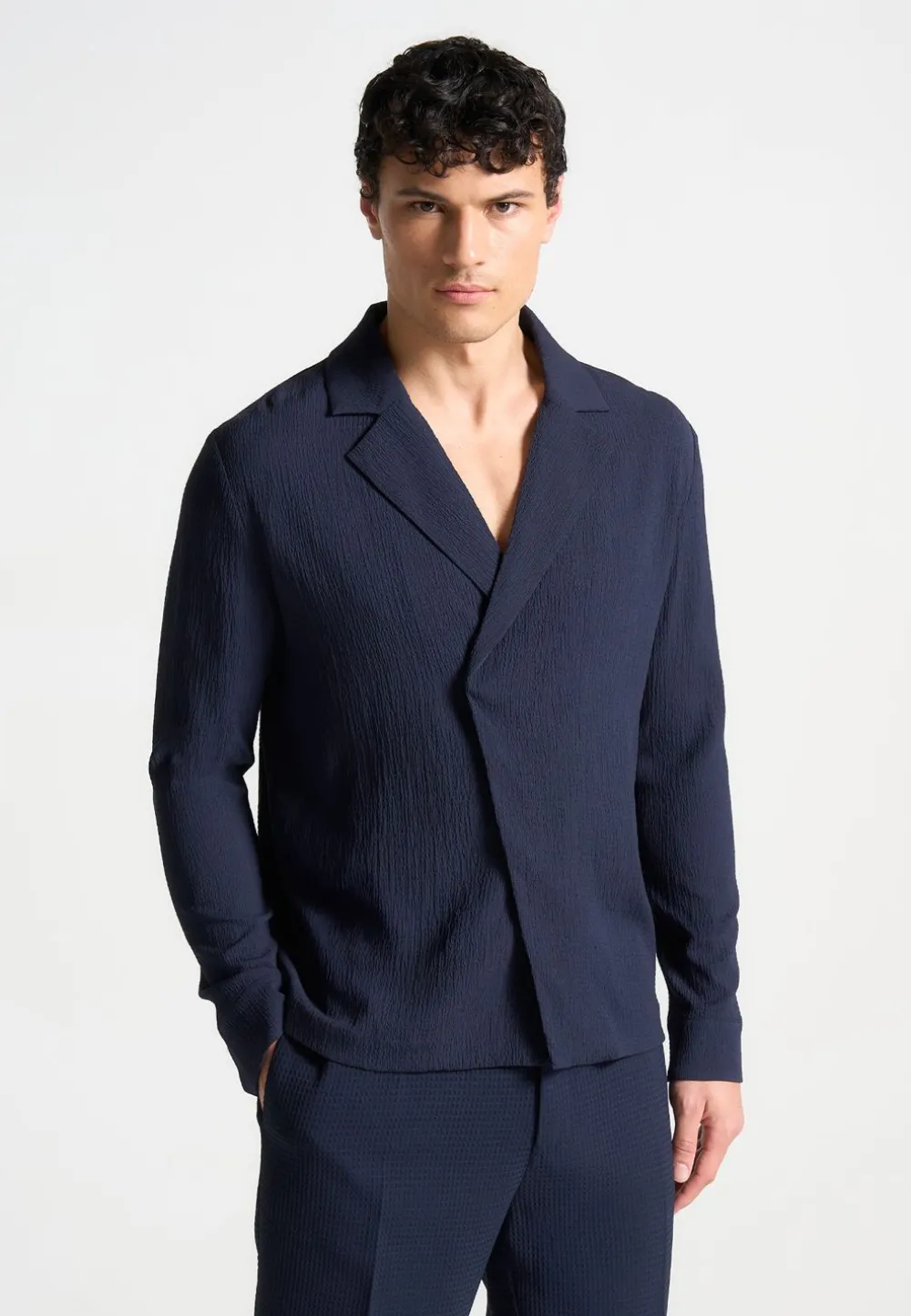 Introducing Our Seersucker Double Breasted Shirt In Navy. This Long-Sleeve Silhouette Presents A Regular Fit With A Relaxed, Open Collar To Ensure Comfortable Wear. With A Secure Internal Button Fastening And Deluxe, Textured Fabric, This Shirt Seamlessly Marries Style With Practicality.