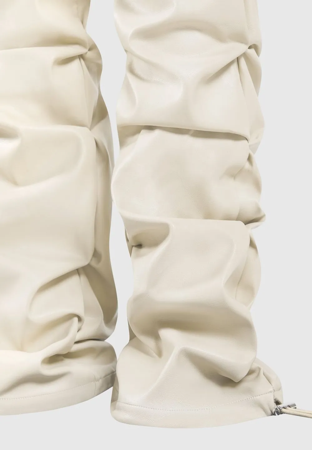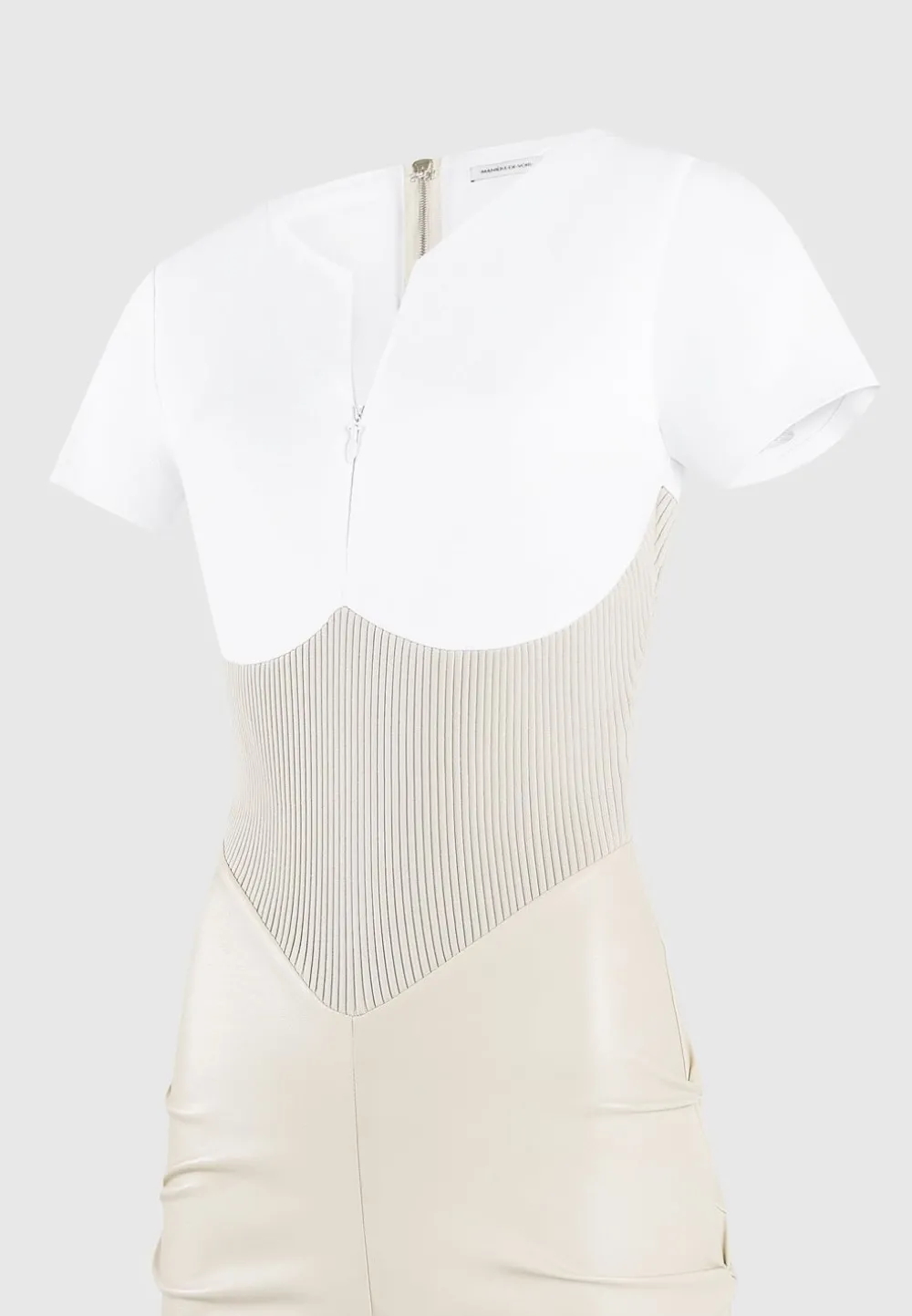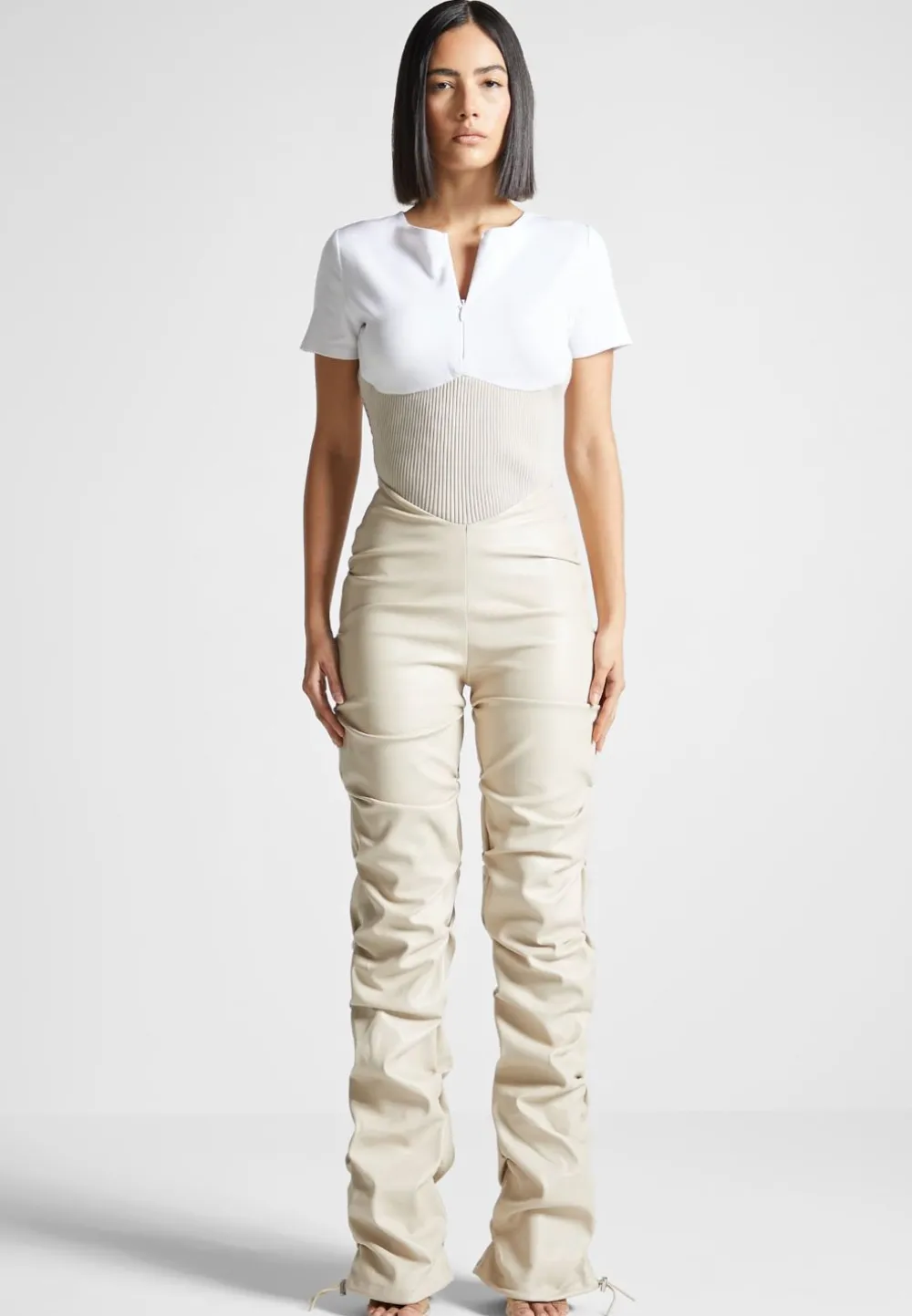 Our Tacked Vegan Leather T-Shirt Jumpsuit Features A Flattering Fit And Cinched Waist Creating A Stunning Ensemble That Effortlessly Combines Fashion-Forward Design. Crafted From High-Quality Vegan Leather, This Jumpsuit Maintains A Luxurious And Edgy Appeal.