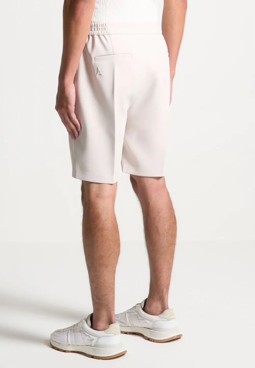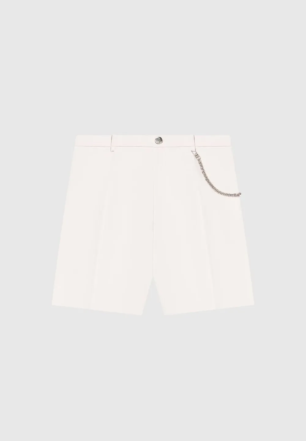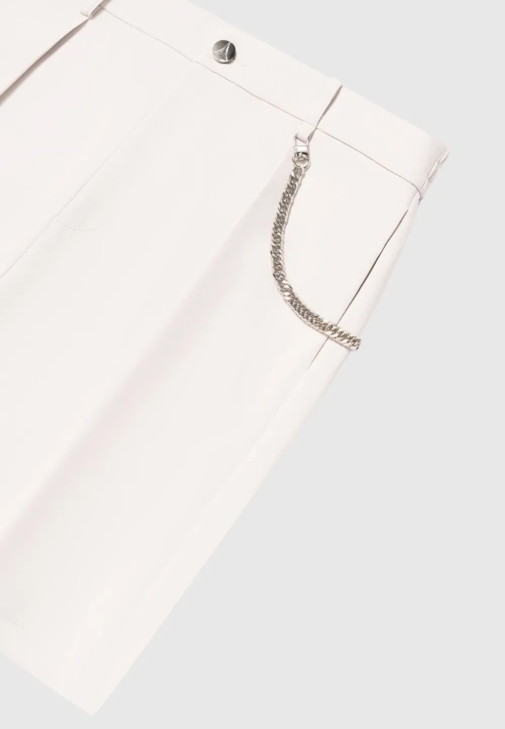 These Tailored Shorts In Stone Are Designed With A Detachable Chain Feature And Silver Hardware. The Embossed Silver Button Adds A Refined Touch, While The Side Slip Pockets Provide Convenience. With A Pleat To Crease Design, These Shorts Create A Sophisticated And Polished Look.