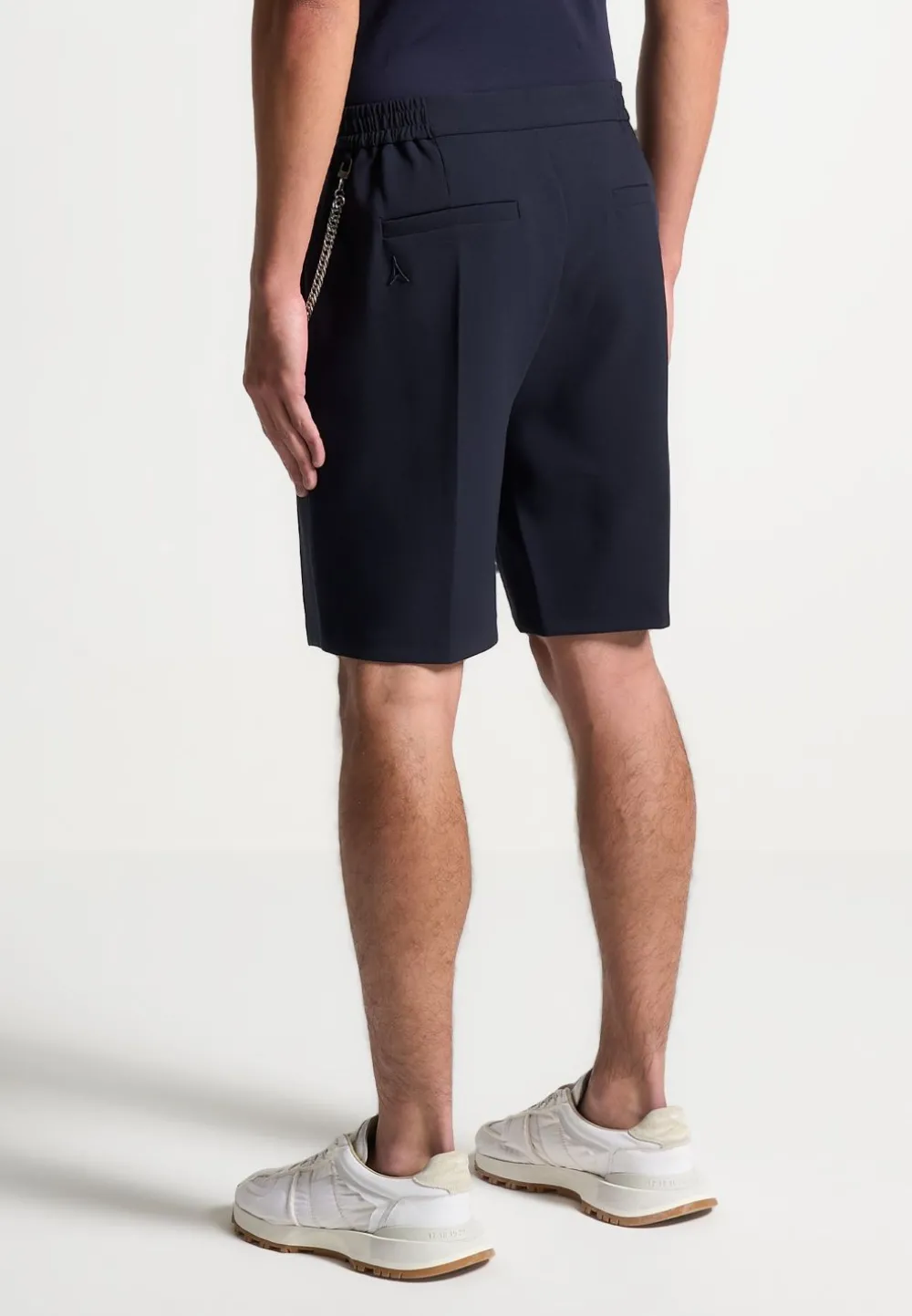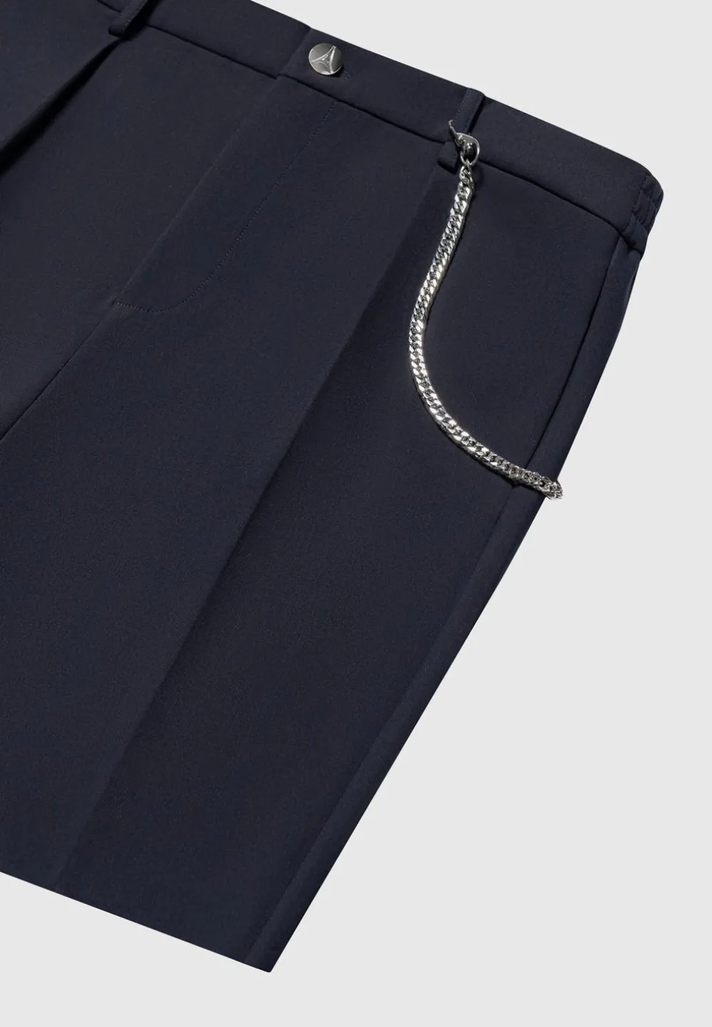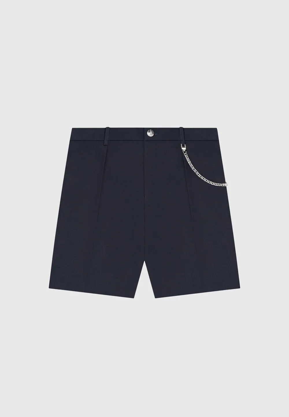 These Tailored Shorts In Navy Are Designed With A Detachable Chain Feature And Silver Hardware. The Embossed Silver Button Adds A Refined Touch, While The Side Slip Pockets Provide Convenience. With A Pleat To Crease Design, These Shorts Create A Sophisticated And Polished Look.