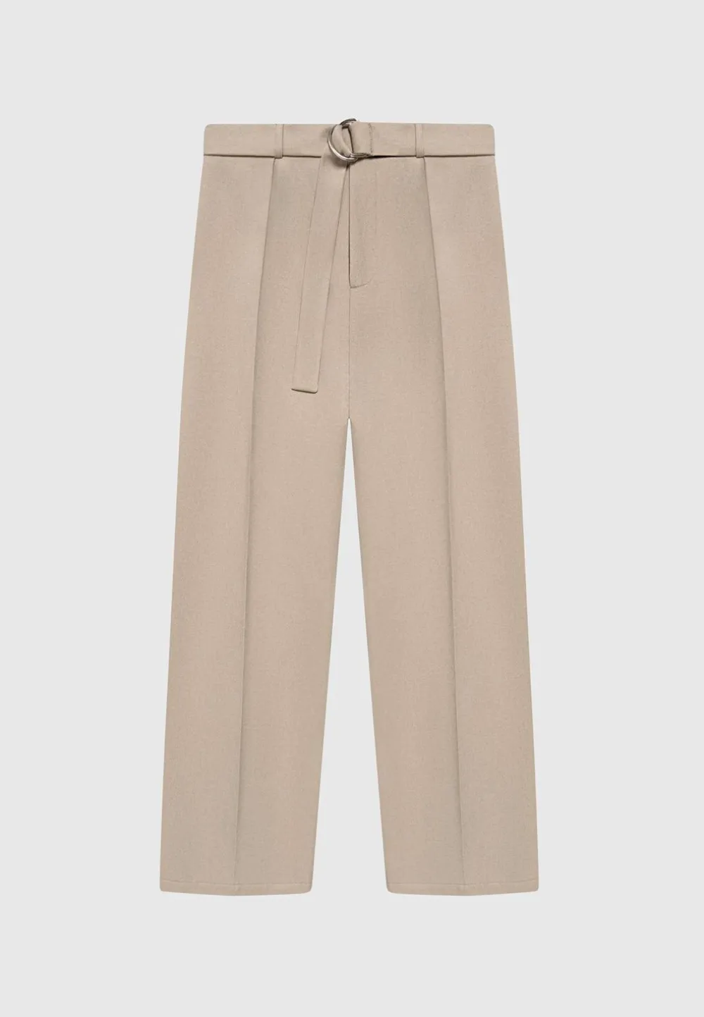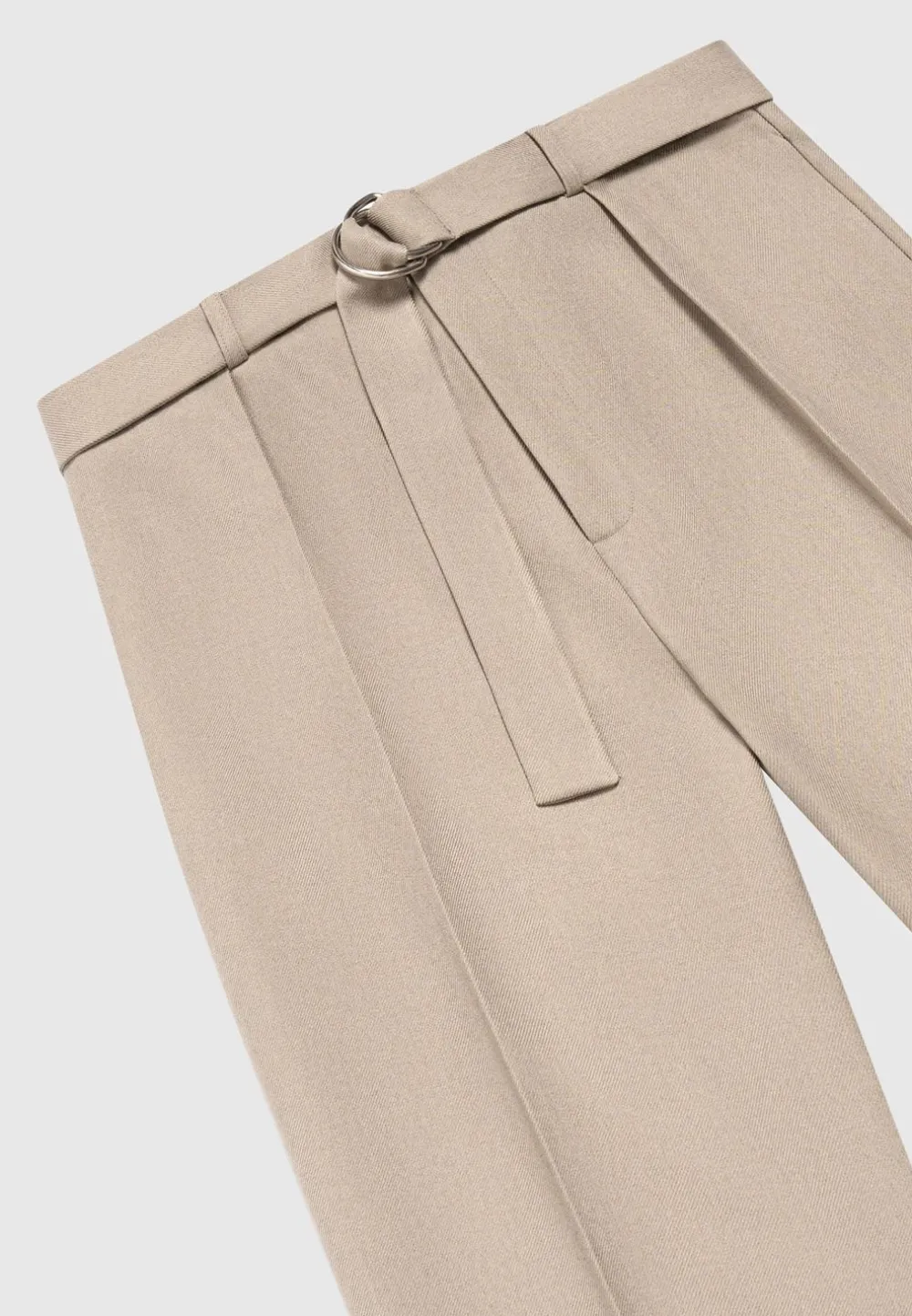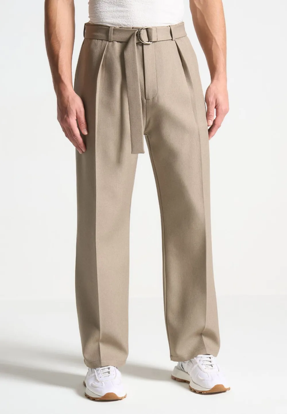 Elevate Your Professional Attire With The Textured Belted Tailored Trousers In Beige. The Pressed Crease Detail Adds A Refined Touch, While The Relaxed Fit And Neutral Tone Combine Comfort And Versatility, Making The Trousers Perfect For Any Occasion.