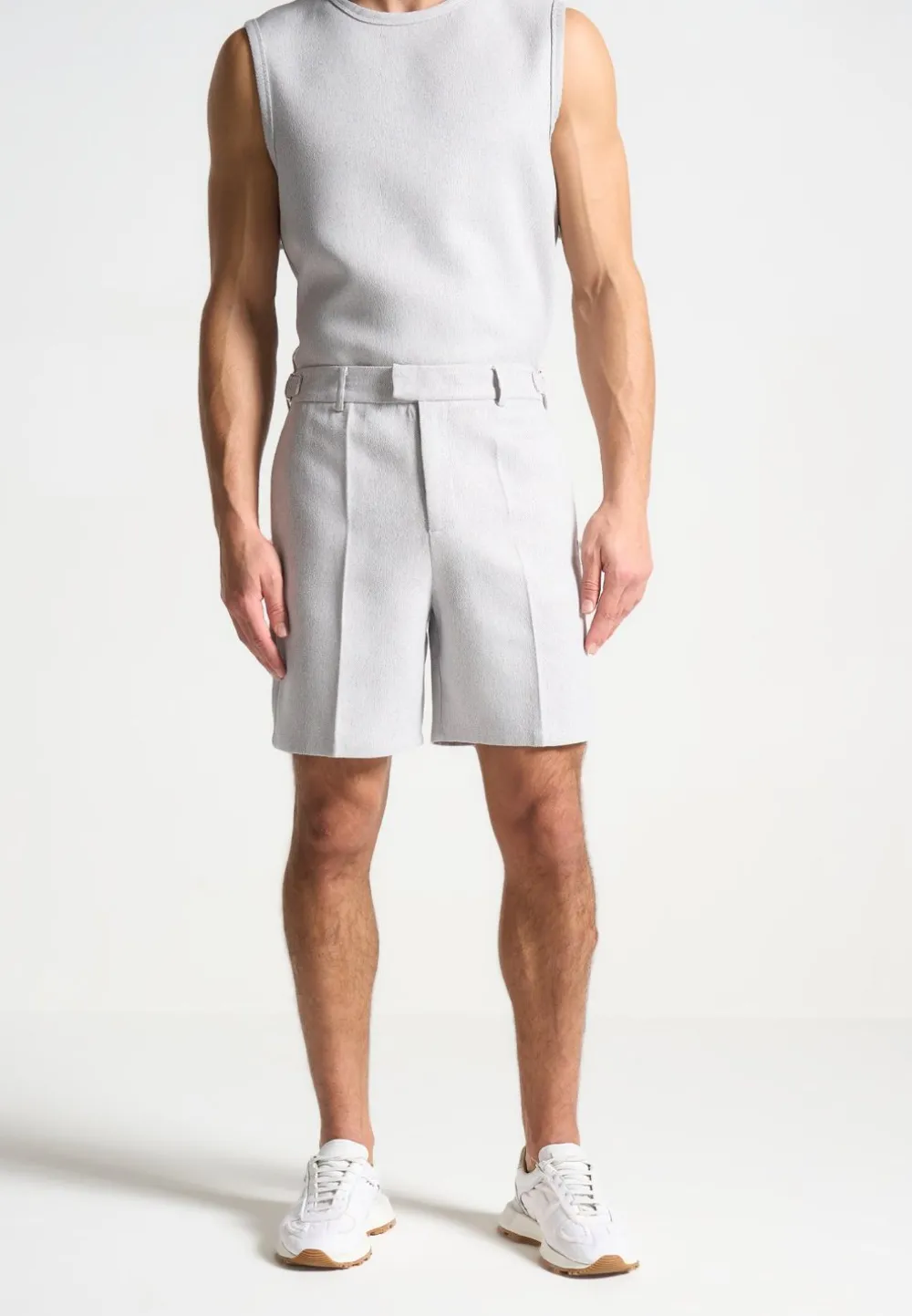 Elevate Your Wardrobe With Our Textured Tailored Shorts In Grey, Offering A Relaxed Fit For Enduring Comfort Throughout The Day. With Side Slip Pockets And A Pleat To Crease Detail, These Trousers Effortlessly Blend Practicality With Style, A Must-Have Addition To Your Collection.