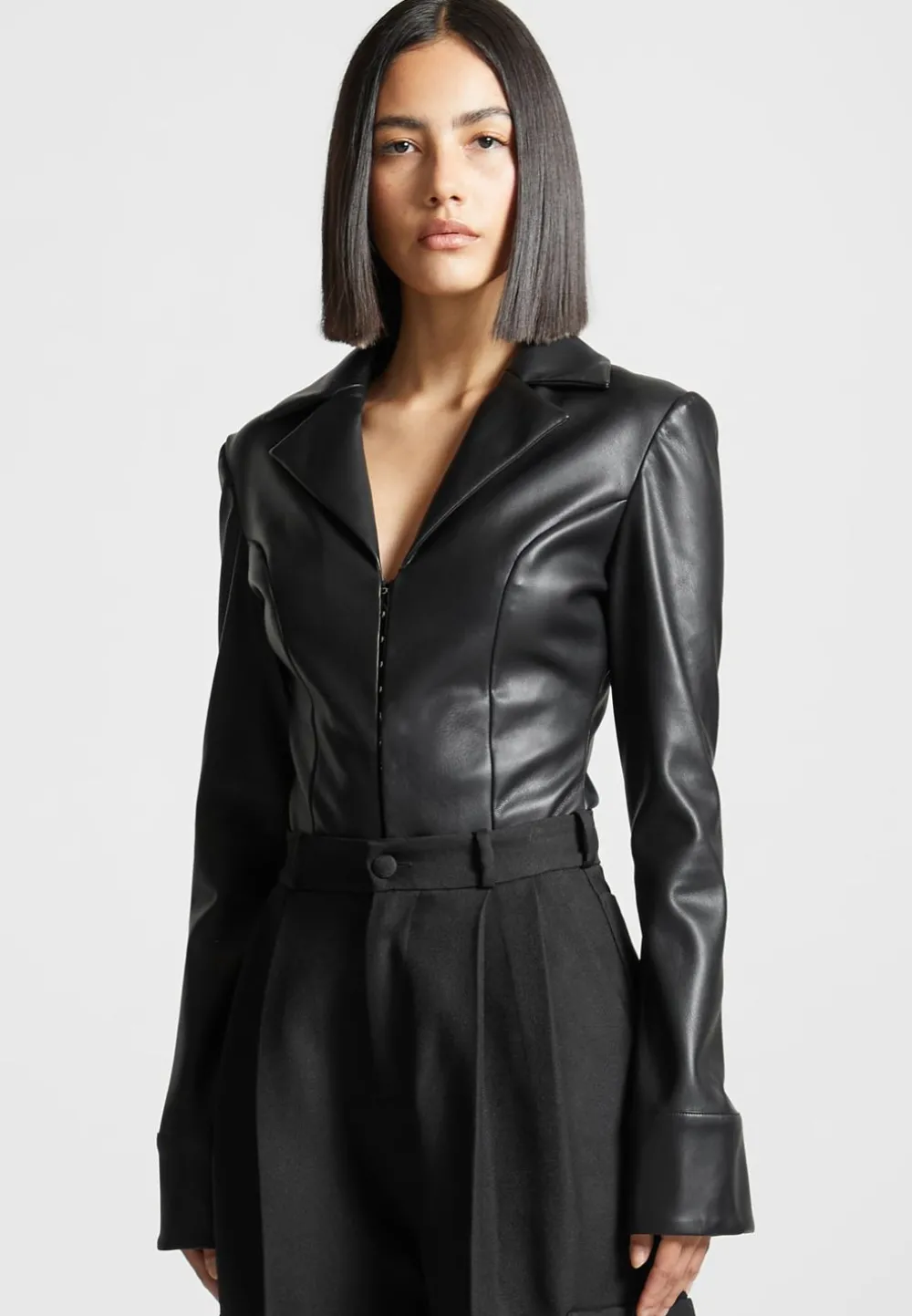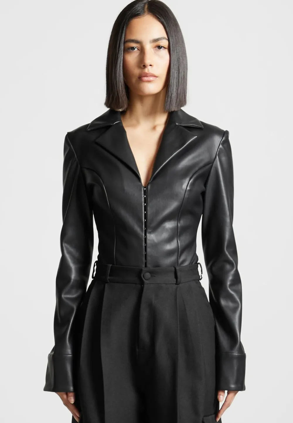 Look Stylish And Stay Comfortable In This Vegan Leather Blazer Bodysuit. Featuring Contour Detailing, It Is Made Of Premium Fabric To Provide A Perfect Fit And Feel. Perfect For Day Or Night Wear – It Is The Ideal Versatile Piece To Keep Your Wardrobe Fresh.