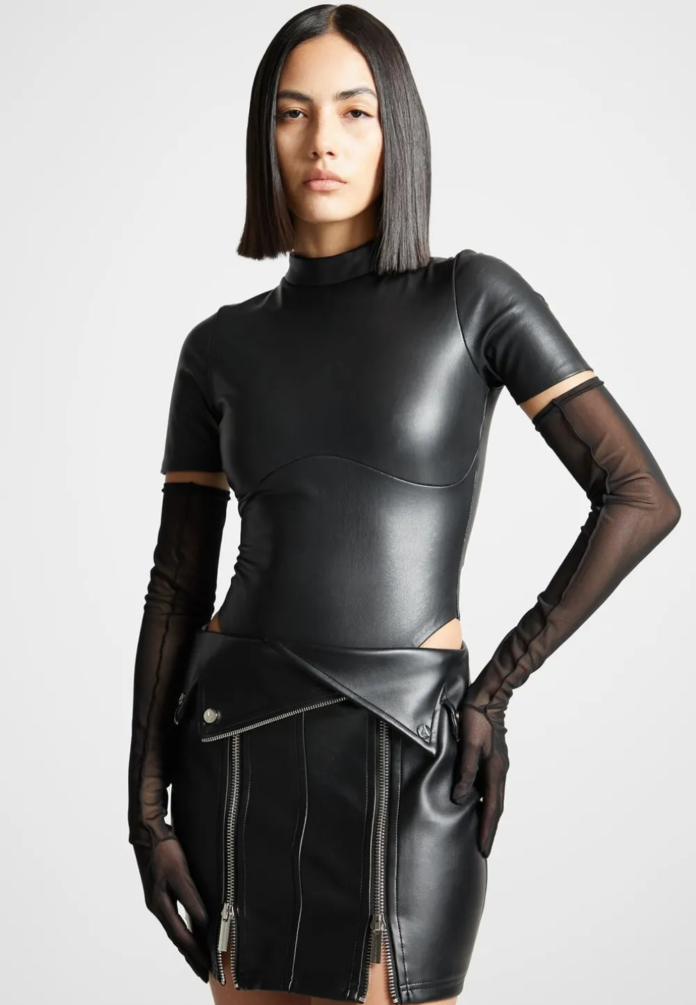 This Vegan Leather Bodysuit Is Designed To Accentuate Your Form With Its Classic Design And Contour Bust Detailing. The Black Colour And Mesh Gloves Provide A Sophisticated And Alluring Look That You Can Wear With Confidence. Perfect For A Night Out Or Your Next Special Event.