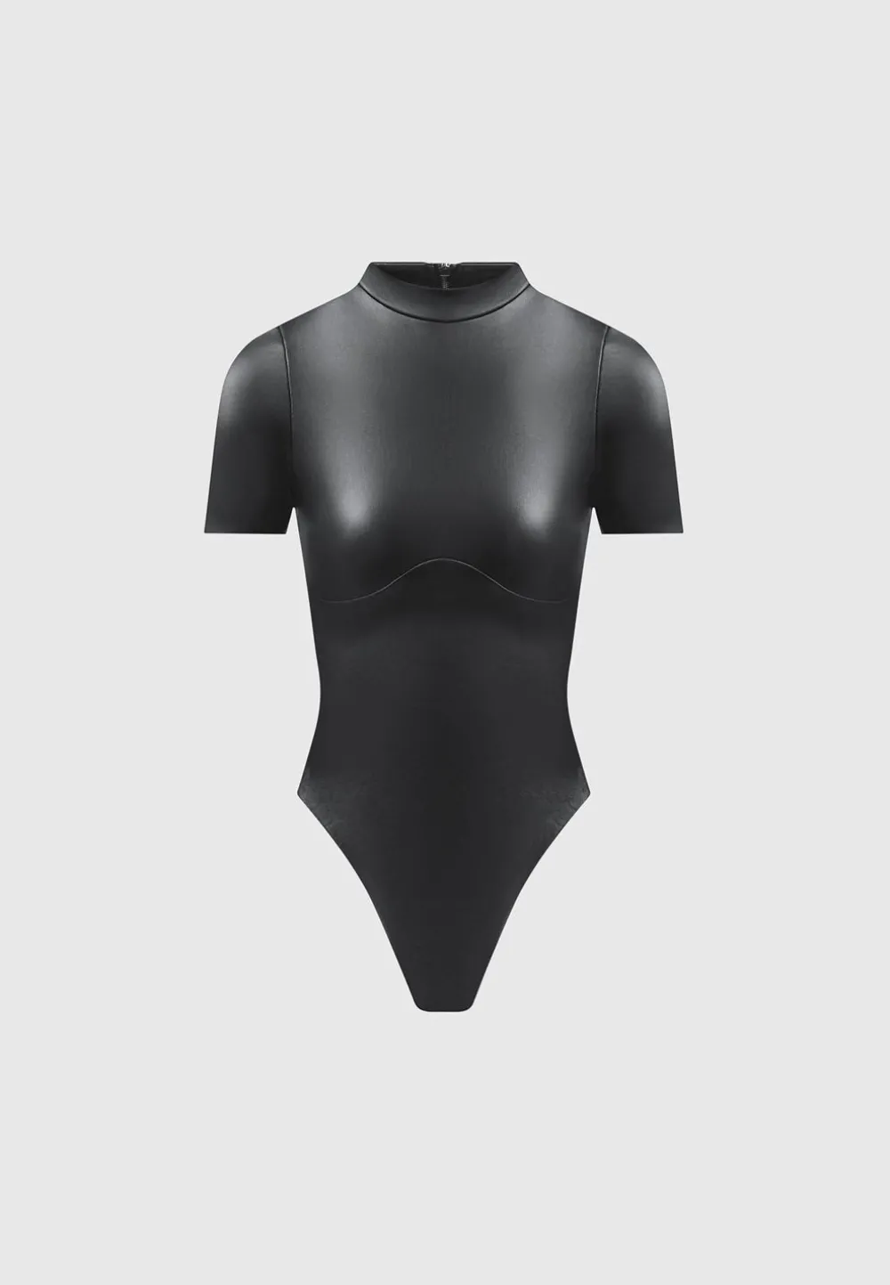 This Vegan Leather Bodysuit Is Designed To Accentuate Your Form With Its Classic Design And Contour Bust Detailing. The Black Colour And Mesh Gloves Provide A Sophisticated And Alluring Look That You Can Wear With Confidence. Perfect For A Night Out Or Your Next Special Event.