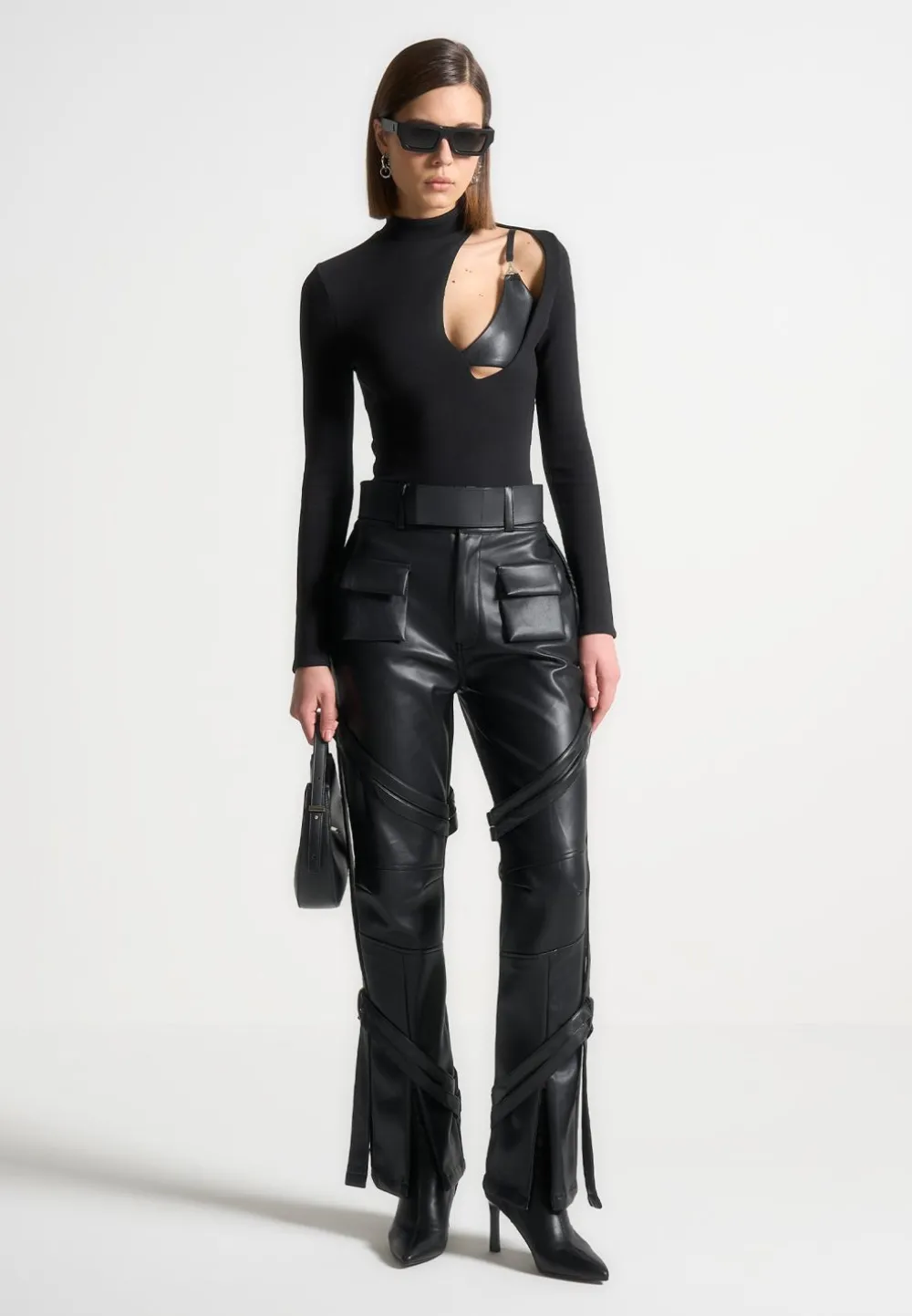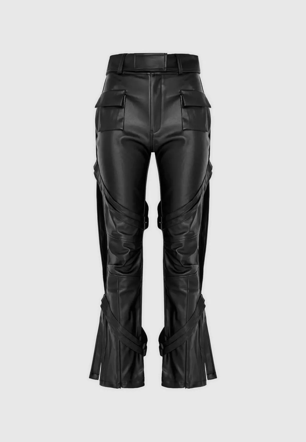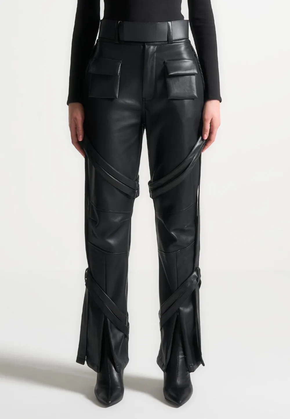 The Vegan Leather Carpenter Cargo Trousers Have A Casual Feel Thanks To The Sizeable Cargo Pockets, But Are Designed With Just As Much Consideration As A Going Out Style. Made From Vegan Leather With A Straight Leg, Deep Waistband And Carpenter Belt Detailing. The Invisible Zips At Hem Can Be Used For Versatile Styling For Both Casual And Dressy Looks.