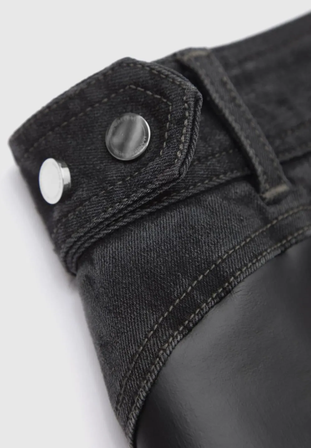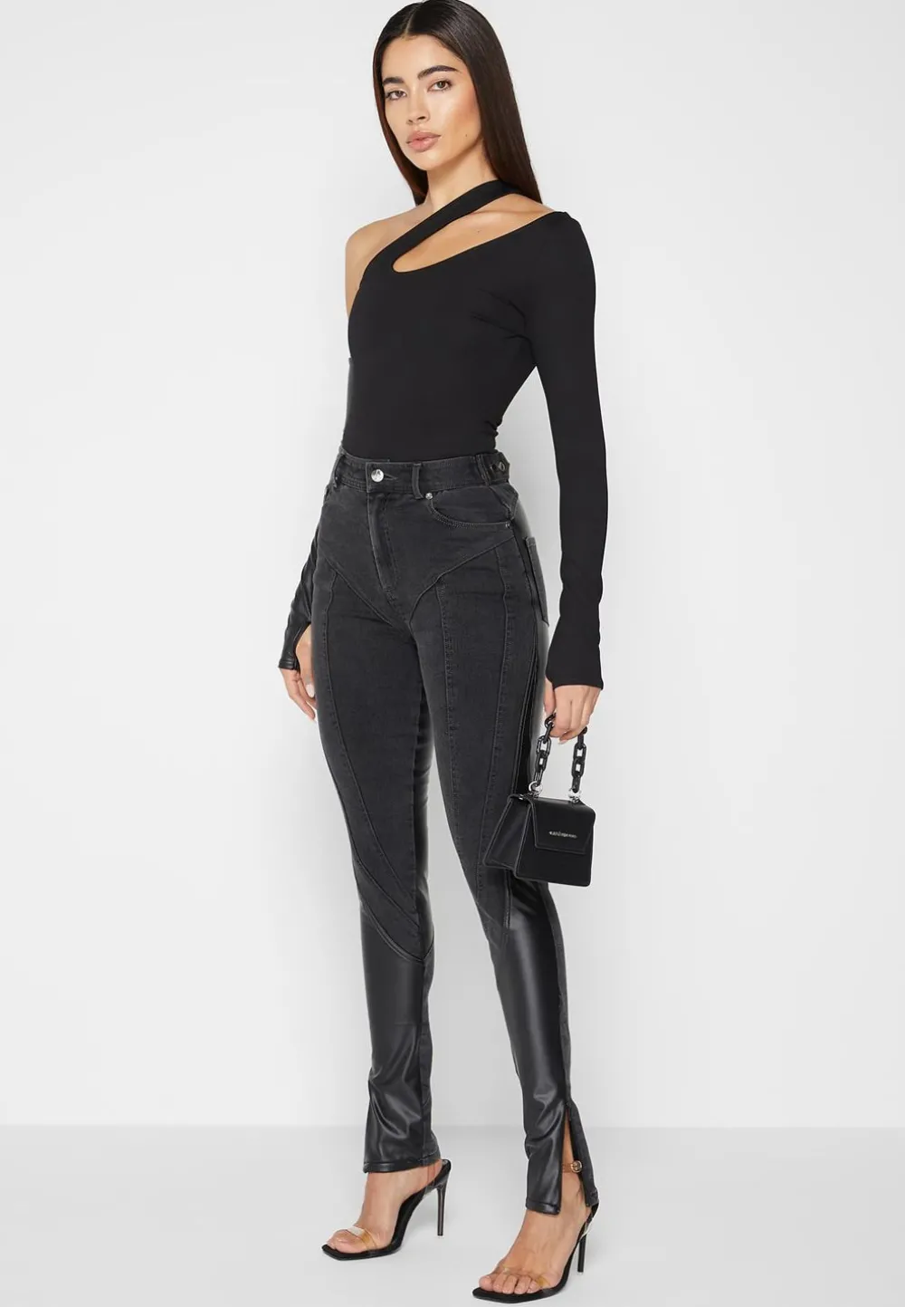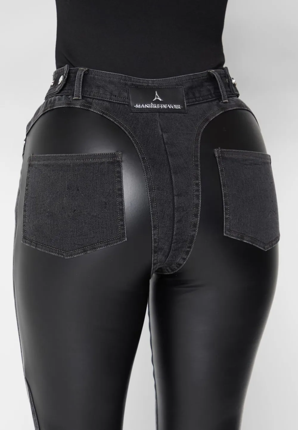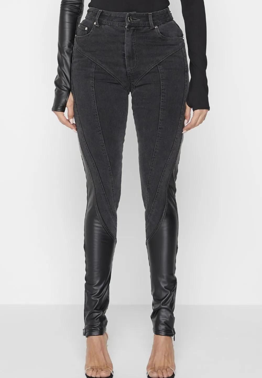 Capturing The Essence Of High Fashion, These Carefully Crafted Jeans Feature A Spiral Effect Using Contrast Vegan Leather That Contours And Lifts The Body. The Waistband Is Adjustable For A Custom Fit To You. These Jeans Are Perfect On A Night Out Paired With Heels.