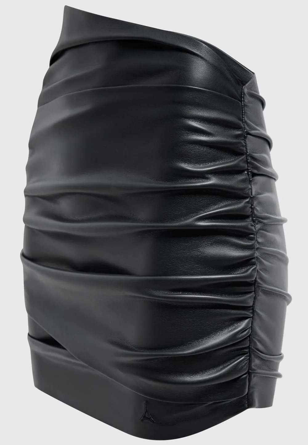 This Black Mini Skirt Is Classic Yet Modern, Featuring Vegan Leather Materials And An Asymmetric Design. Its Ruched Detailing And Figure-Flattering Silhouette Combine To Create A Timeless Look For Any Occasion.