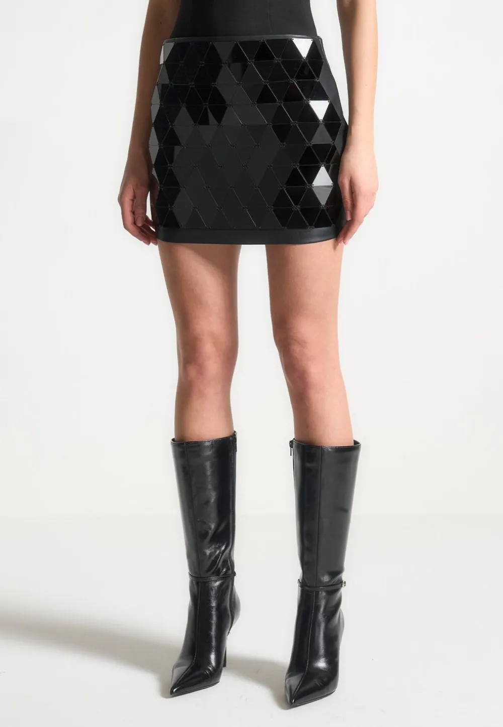 This Mini Skirt Is Crafted From Luxurious Vegan Leather And Beautifully Embellished With Unique Mirrored Accents, Ensuring You Stand Out In Any Crowd. Add A Statement To Any Outfit With This Chic, Stylish Piece.
