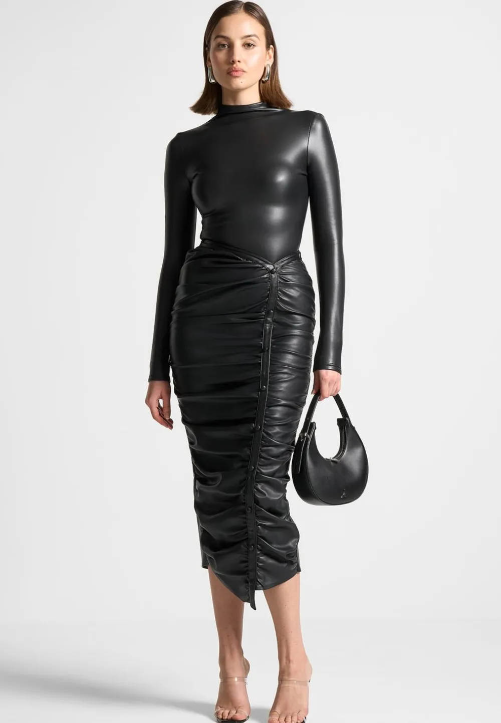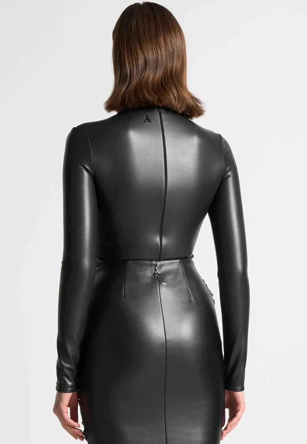 This Beautiful And Sleek Vegan Leather Mock Neck Bodysuit Is Perfect For A Stylish Look. It Features A High Neck And Long Sleeves, Ensuring Maximum Comfort And Coverage. Crafted From Premium Grade Vegan Leather, This Bodysuit Is Sure To Make You Stand Out.