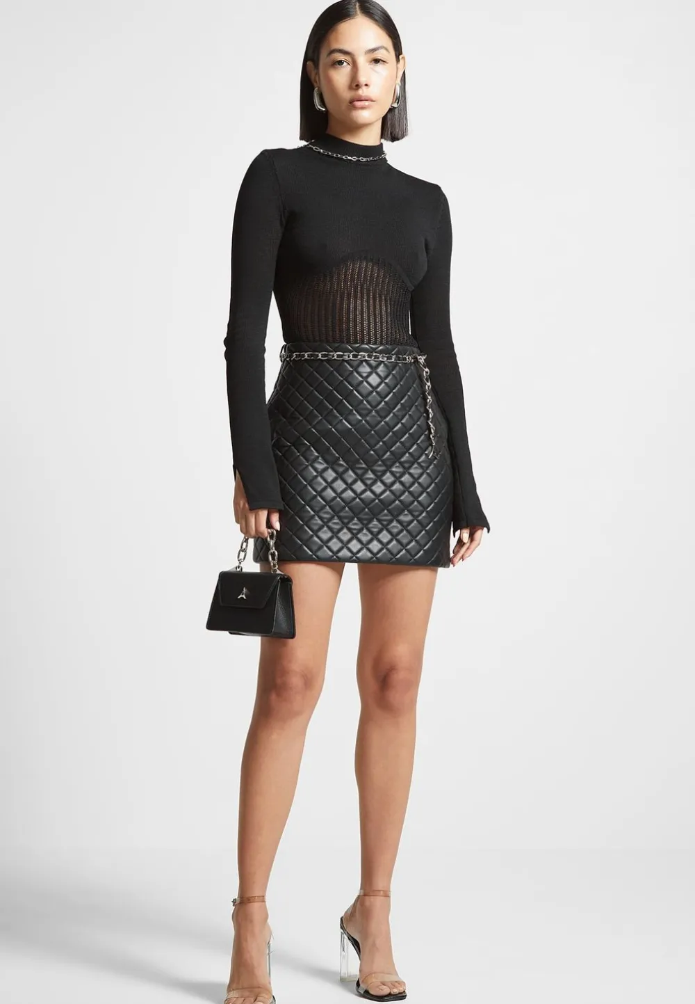 This Vegan Leather Mini Skirt Is Designed For Fashion-Forward Style. The Classic Quilted Pattern Features A Unique Chain Detail With A Bold, Black Finish. Elevate Any Look With This Luxurious Skirt.