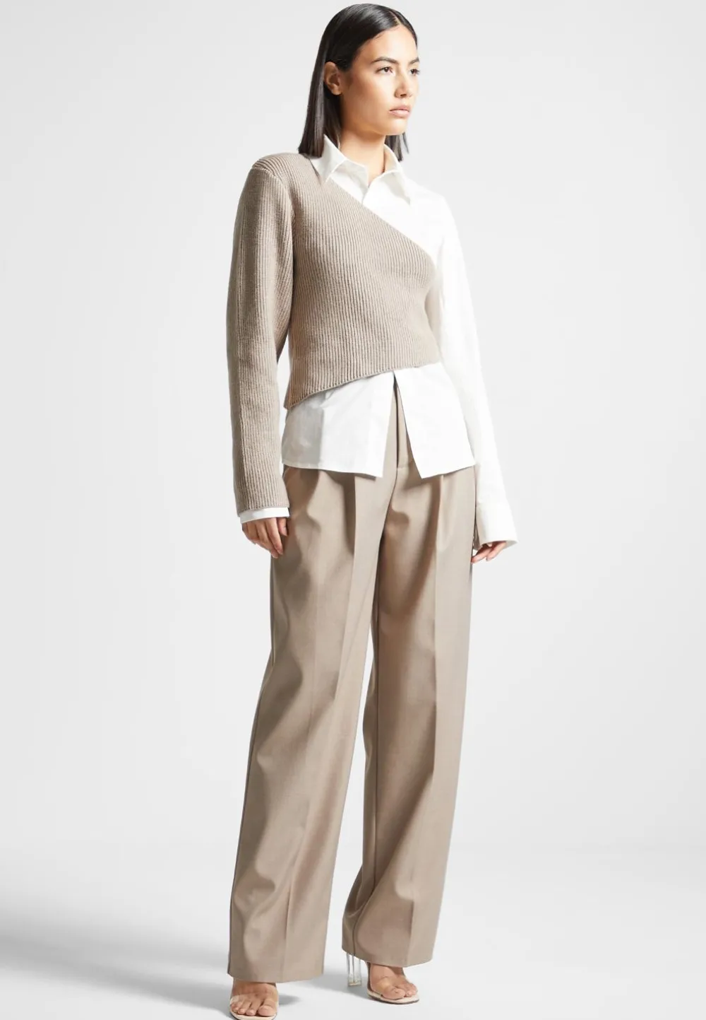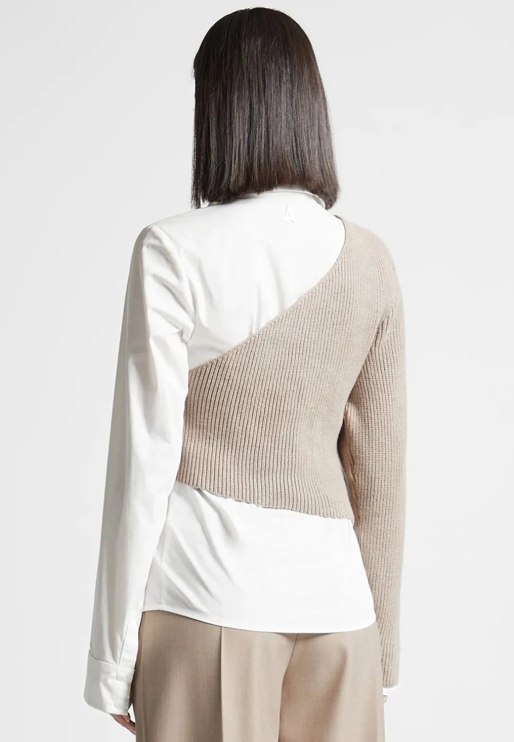 This Unique Asymmetric Knitted Overlay Shirt Is Designed With Different Colour Tones For A Chic Yet Comfortable Look. The Detachable Knitted Overlay Adds An Extra Level Of Versatility While Still Delivering A Stylish Statement. Perfect For Any Occasion.
