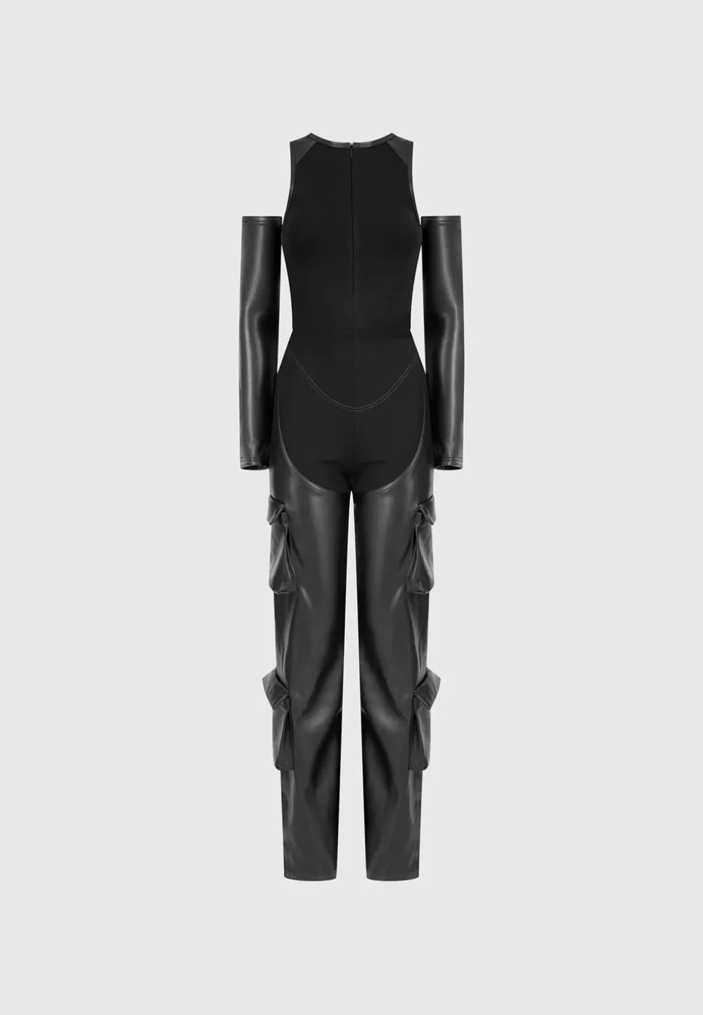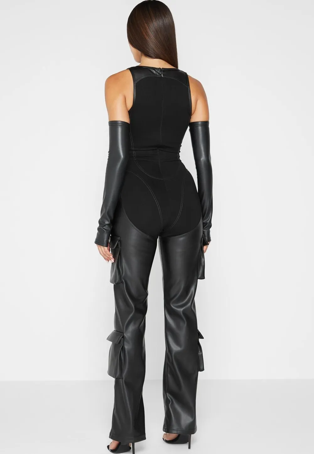 The Contouring Effect On The Bodice Of This Jumpsuit Combined With The Bandage Fabric Cinch The Waist While The Vegan Leather Legs Drape Effortlessly.