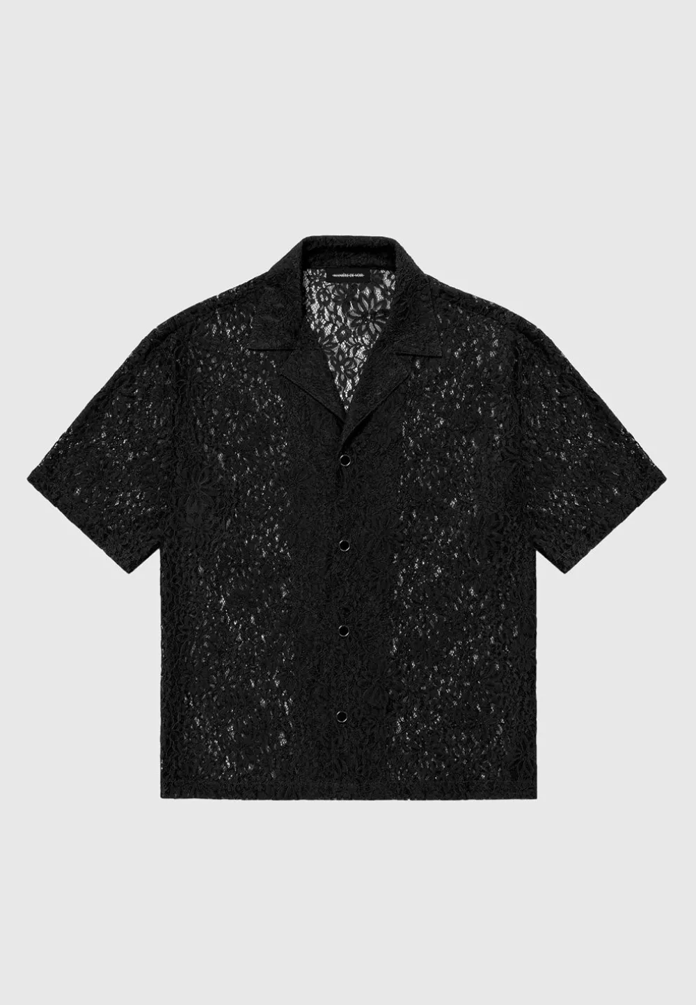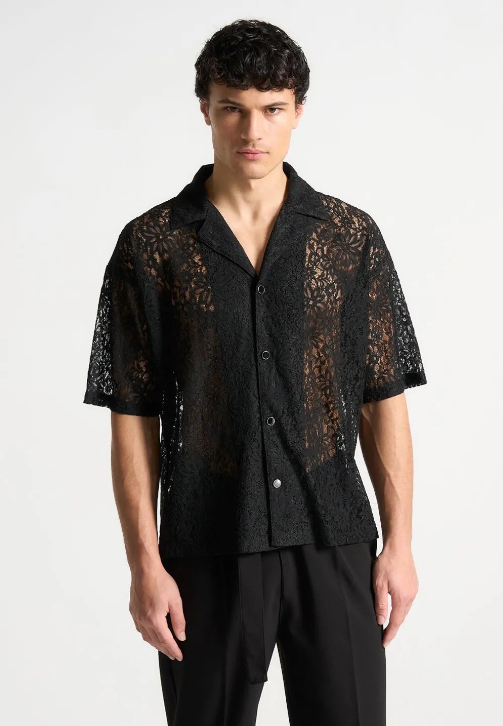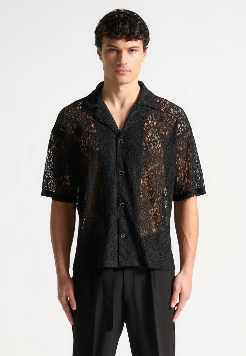 Meticulously Crafted With Delicate Lace, The Boxy Lace Revere Shirt Seamlessly Merges Breathability With Sophistication. The Revere Collar And Boxy Fit Emanates Masculinity And Refinement, While The Subtle Gold-Rim Button Detailing Adds A Touch Of Understated Luxury. Versatile For Any Occasion, This Shirt Is An Essential Wardrobe Staple.
