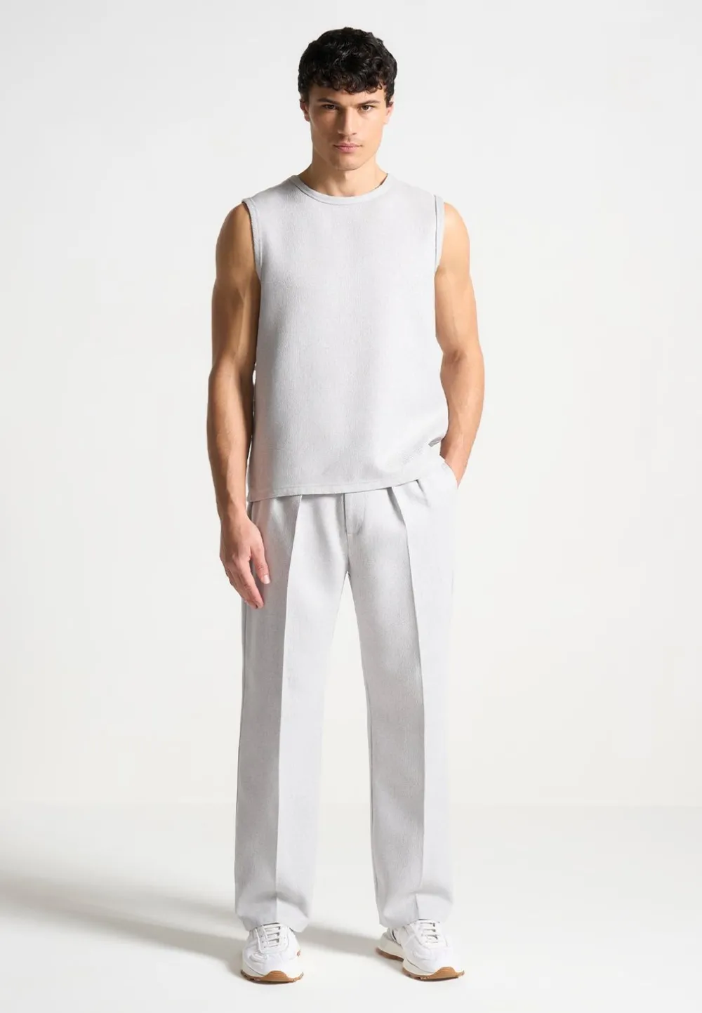 Our Boxy Textured Vest In Grey, Expertly Crafted With A Relaxed Fit, Offers Both Comfort And Style. The Sleeveless Design And Soft Material Provide A Lightweight Feel, While The Embroidered Eiffel Detail Adds A Touch Of Sophistication. Perfect For Any Discerning Wardrobe, It’s A Must-Have For Layering Or Wearing Alone.