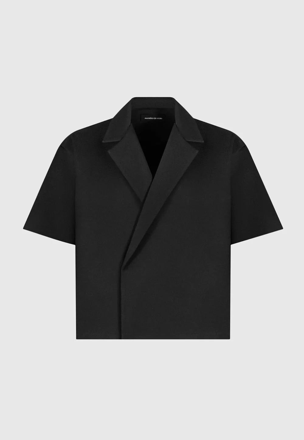 Meticulously Designed With An Open Collar And Relaxed Fit, Our Boxy Twill Double Breasted Shirt In Classic Black Embodies Timeless Style. The Short Sleeve Silhouette Adds A Contemporary Touch, Ensuring Its Versatility In Any Wardrobe. Stay Both Comfortable And Polished Throughout The Day.