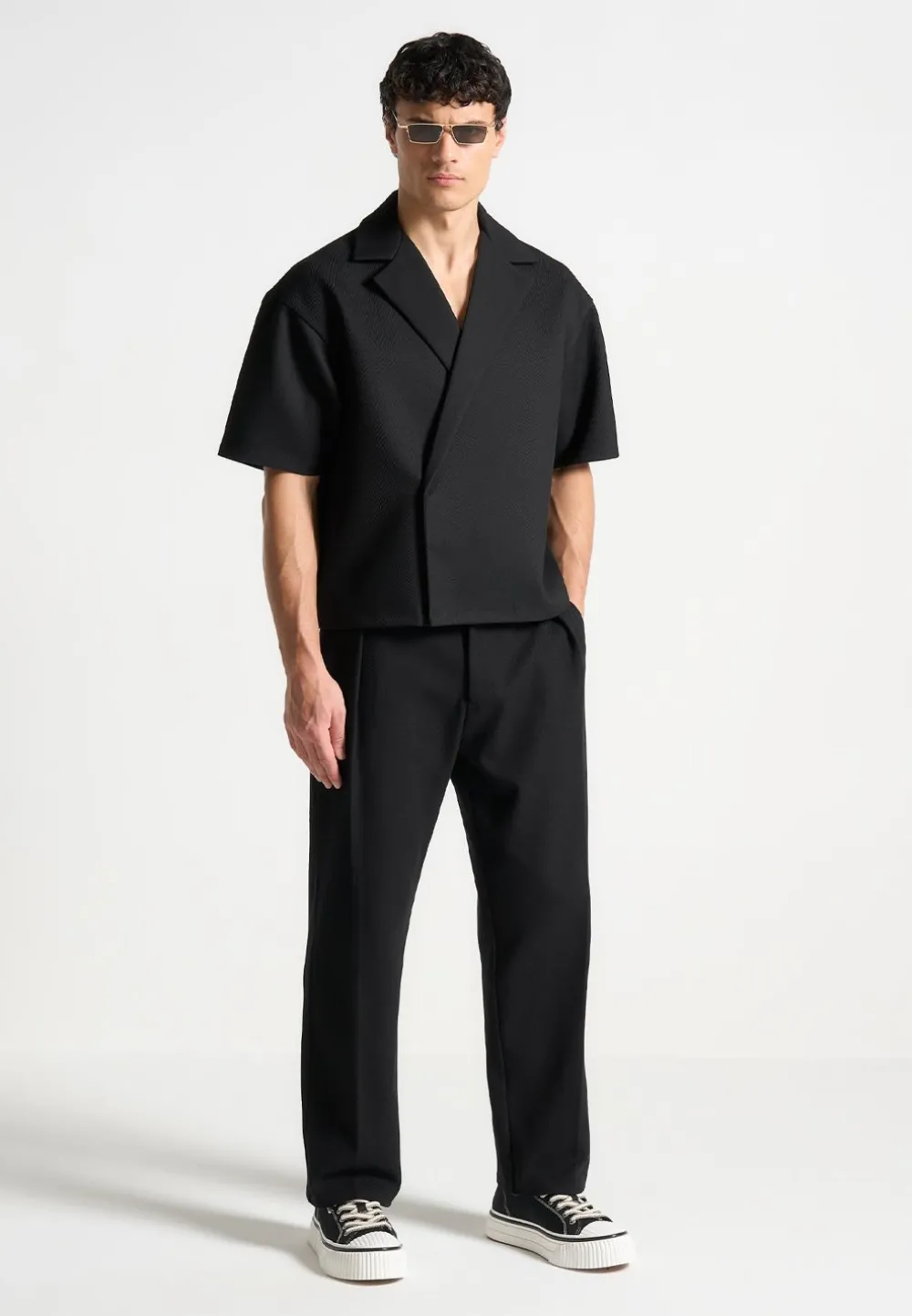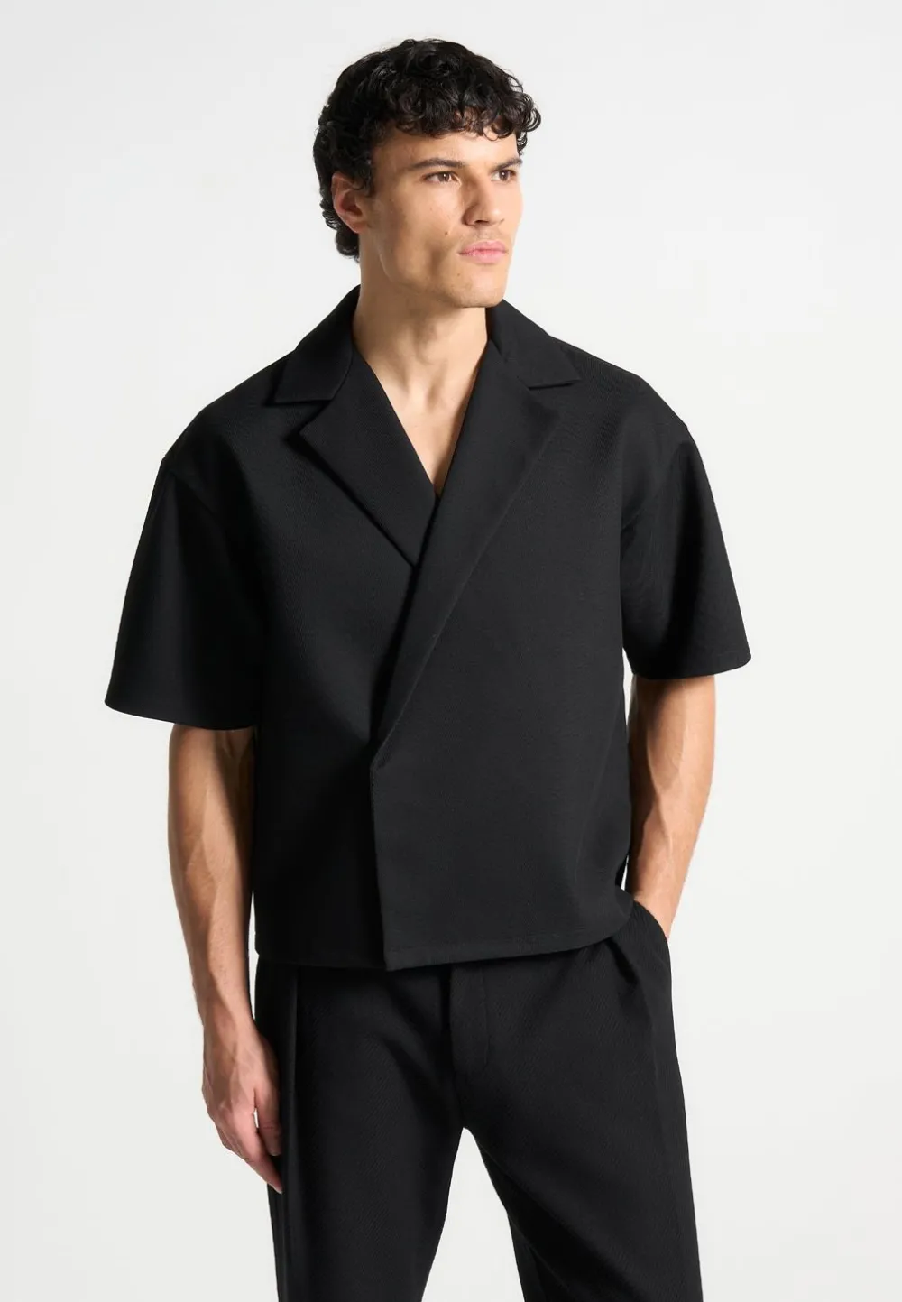 Meticulously Designed With An Open Collar And Relaxed Fit, Our Boxy Twill Double Breasted Shirt In Classic Black Embodies Timeless Style. The Short Sleeve Silhouette Adds A Contemporary Touch, Ensuring Its Versatility In Any Wardrobe. Stay Both Comfortable And Polished Throughout The Day.