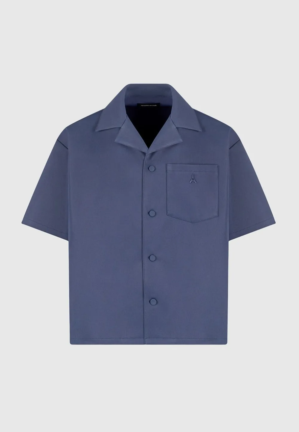 Elevate Your Wardrobe With Our Boxy Twill Revere Shirt In Steel Blue, Meticulously Tailored With A Boxy Fit To Suit Any Body Type. The Tonal Embroidery On The Front Pocket Adds A Refined Touch, Complemented By The Tonal Fabric Covered Buttons And Revere Collar To Complete The Ensemble.