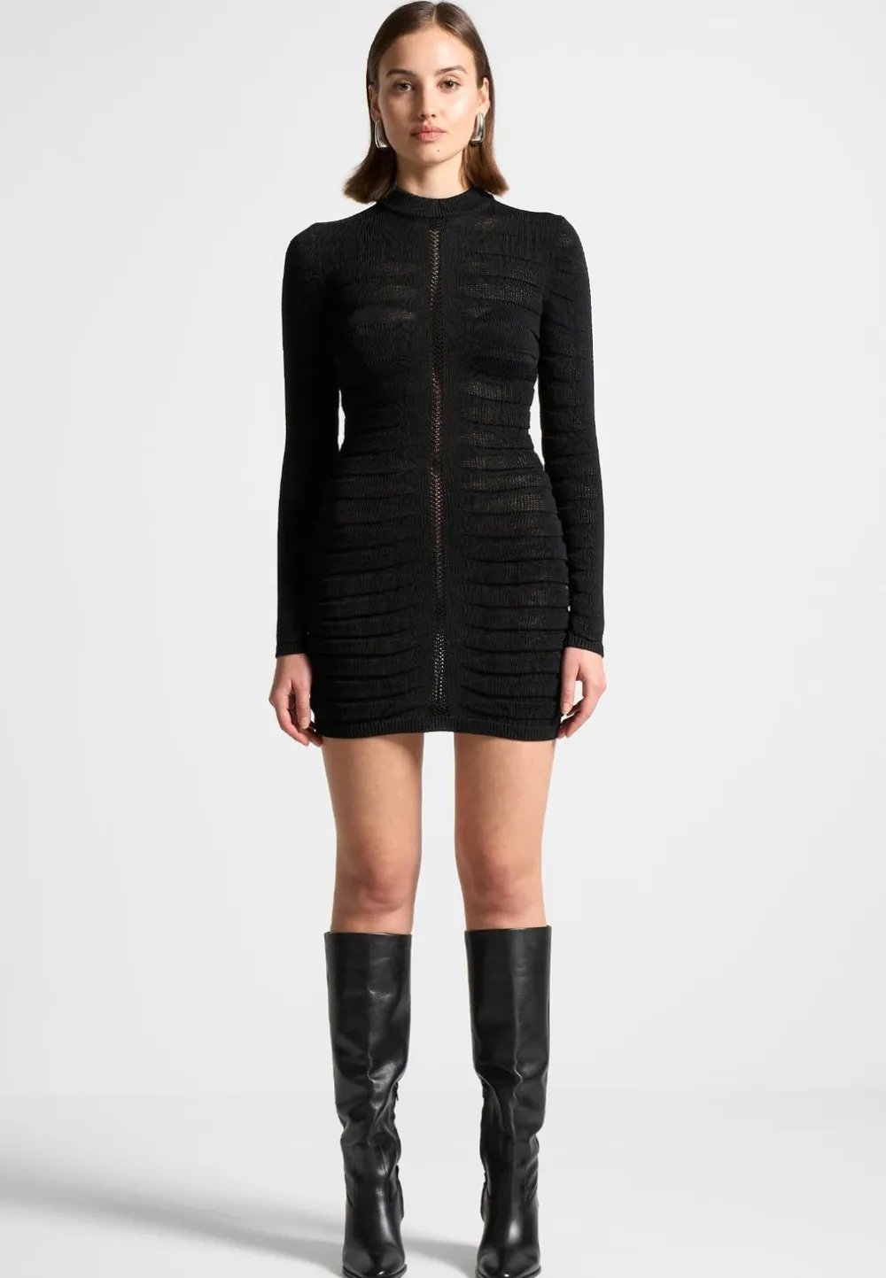 This Classic Black Knit Mini Dress Features Knit Contour Detailing And A Soft Touch For A Flattering Fit. Perfect For A Night Out, The Figure-Hugging Material Is Sure To Make An Impression.