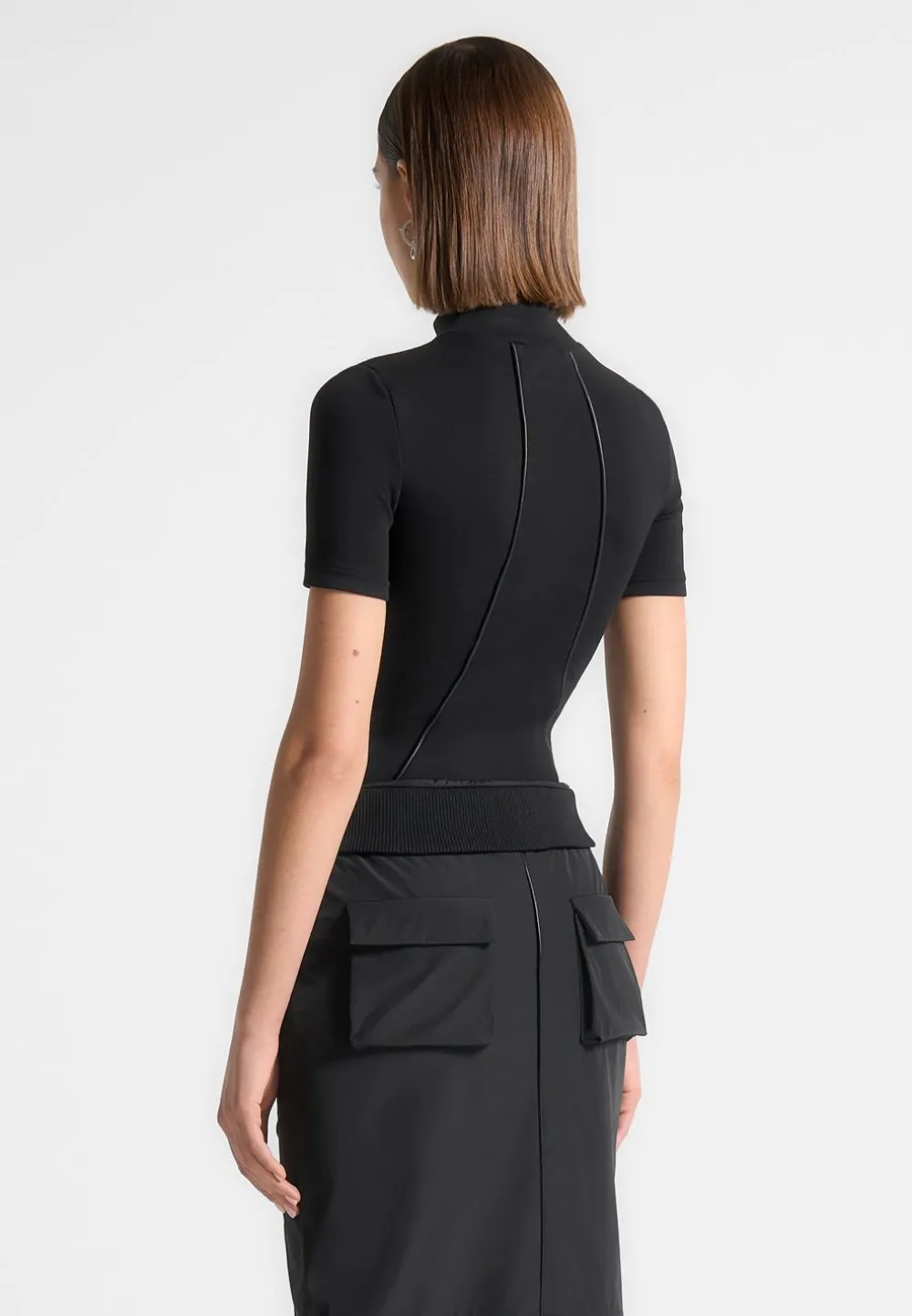 The Contour Mock Neck T-Shirt Bodysuit In Black Offers A Modern And Sleek Look With Its High Neckline And Contour Detailing. The Short Sleeves Add A Touch Of Versatility, Making It A Perfect Addition To Any Wardrobe. Elevate Your Style With This Sophisticated And Form-Flattering Bodysuit.
