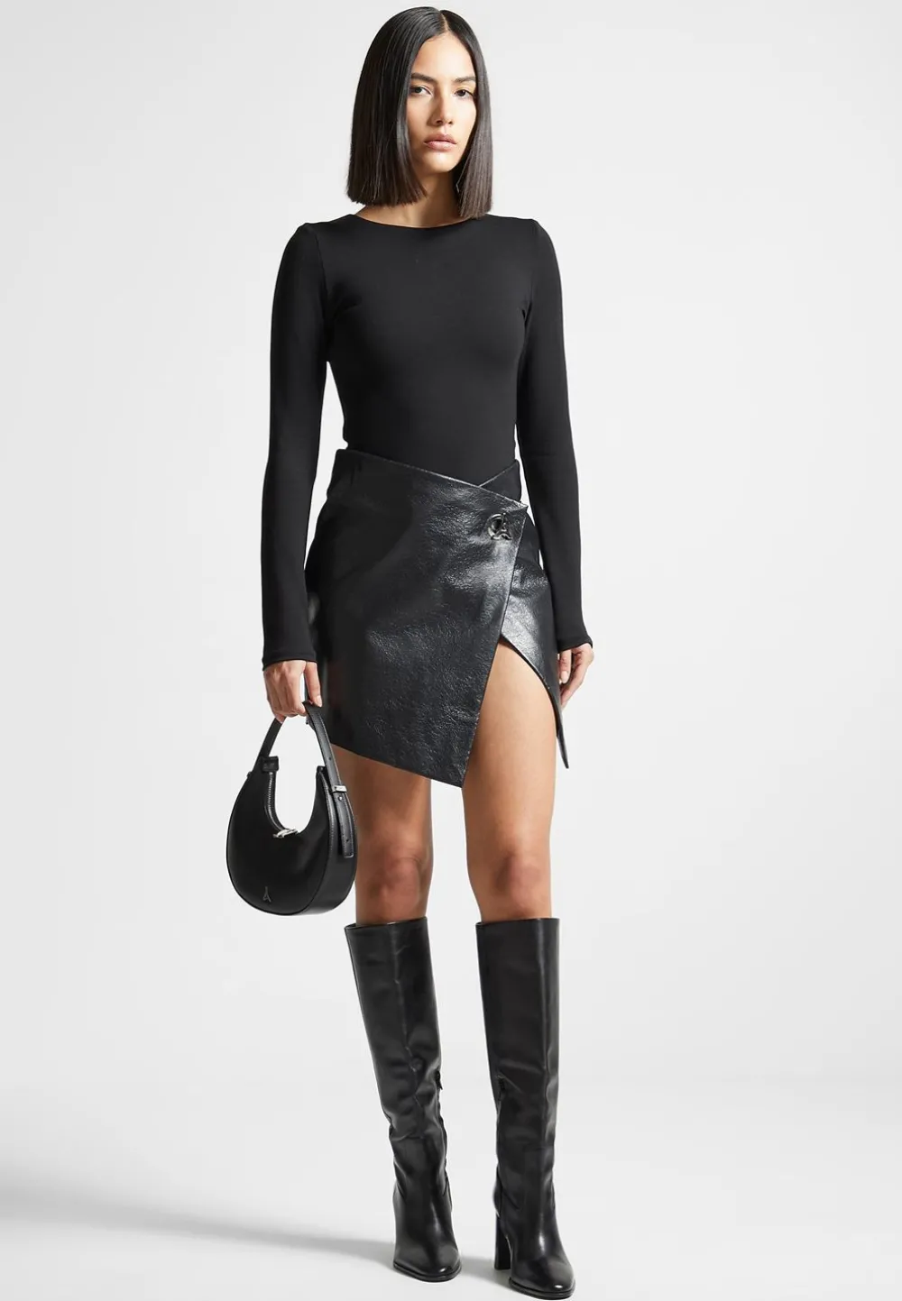 This Edgy Cracked Vegan Leather Wrap Skirt Is Made With A Textured Premium Fabric And Features A Chain Detail To Complete The Look. Perfect For Day-To-Night Wear And Adding Edge To Any Outfit.