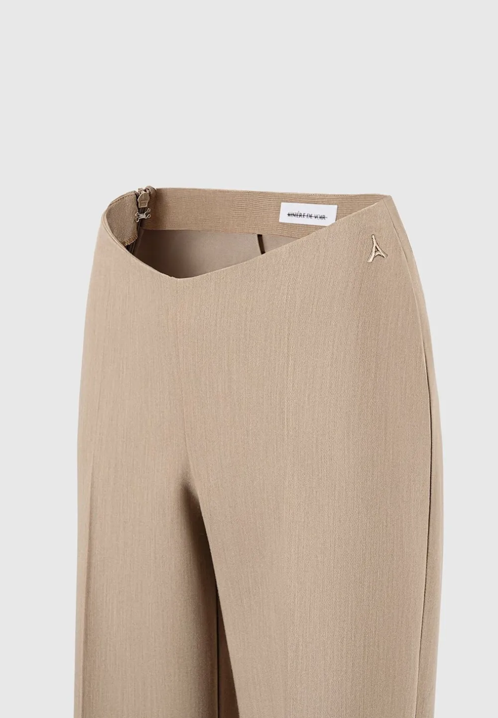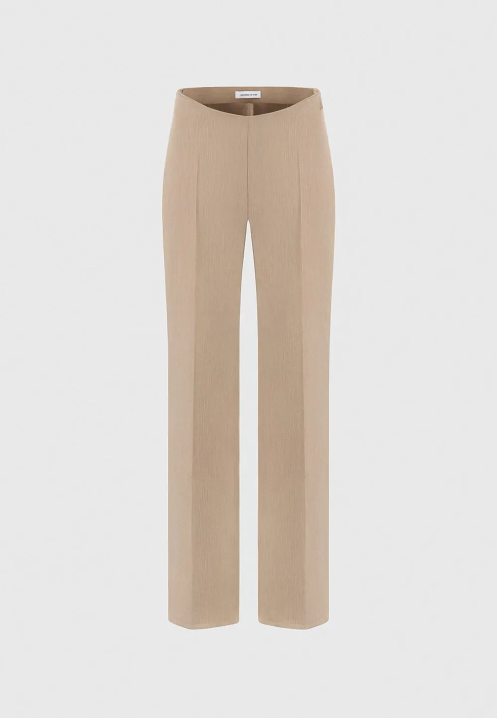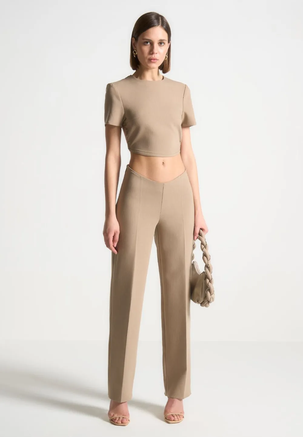These Curved Waist Tailored Trousers In Dark Beige Are Perfect For Both A Dressed Up Or Smart Casual Look. Featuring Crease Detailing For A Tailored Look And A Curved Waistband For Added Style, These Trousers Are Versatile And Chic; A Must-Have For Any Wardrobe.