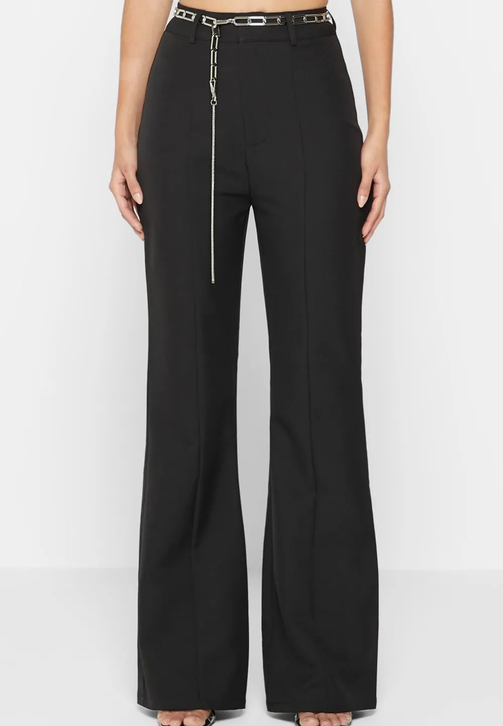 These Stylish Black Trousers Offer A Flattering Fit And Feature A Detailed Chain Belt For A Modern Twist. The Fit And Flare Design Creates A Smooth And Elegant Silhouette, Perfect For Any Occasion.