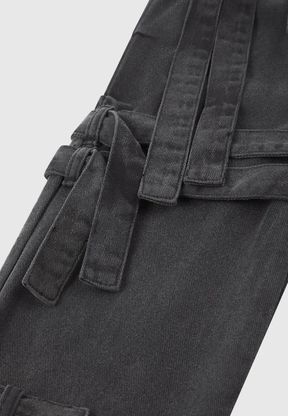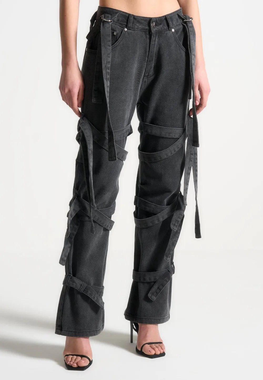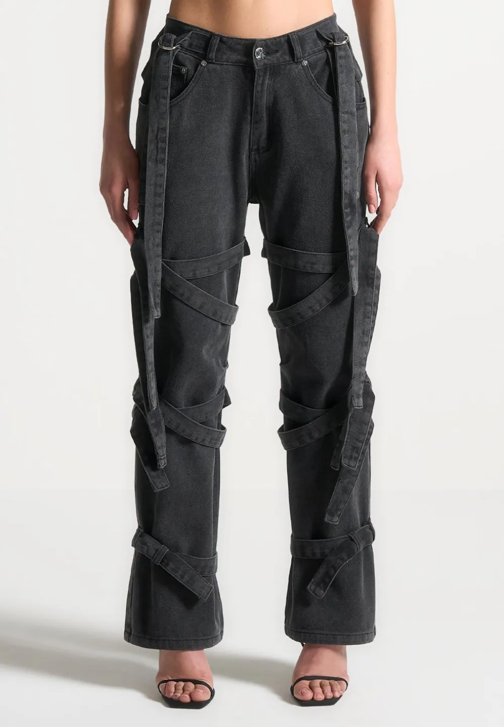 The Exaggerated Leg Strap Detailing Adds An Edgy Element To These Denim Strap Cargo Jeans. Style With A Pair Of Sneakers For An Effortlessly Cool Look.