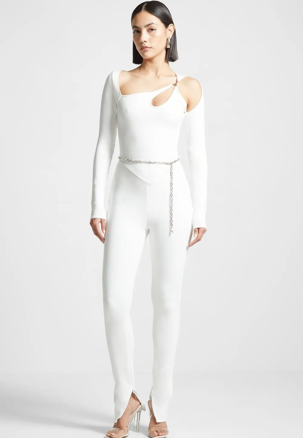 Stay Fashionable And Comfortable With This Off White Eiffel Jumpsuit, Perfect For Any Night Out. With Its Elegant Cut Out Detailing, You’Ll Look Chic And Sophisticated Without Sacrificing Comfort. Add This To Your Wardrobe For A Stylish Look Without The Hassle.