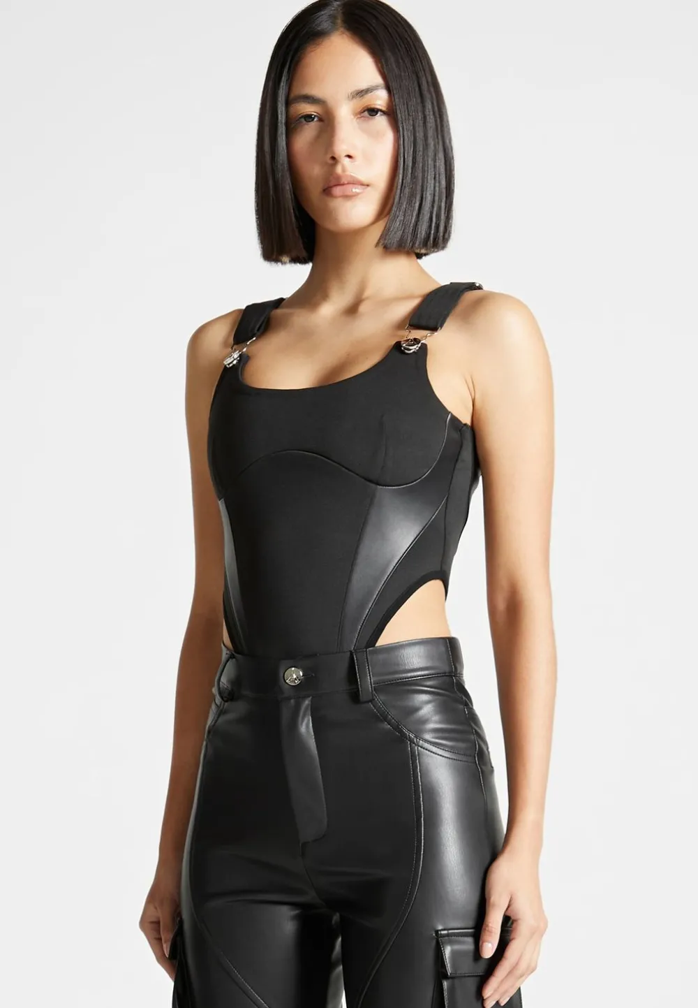 The Eiffel Detail High Leg Bodysuit Is Elegantly Designed With Vegan Leather Detailing. The Adjustable Straps Make For A Perfect Custom Fit, While Adding A Stylish Detail. Create A Timeless Look That’s Sure To Turn Heads.